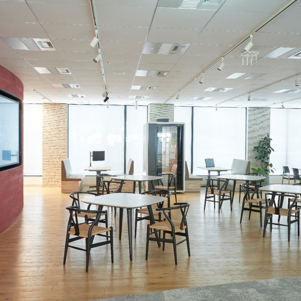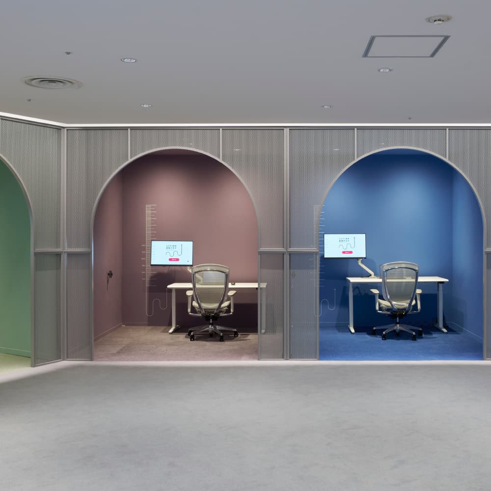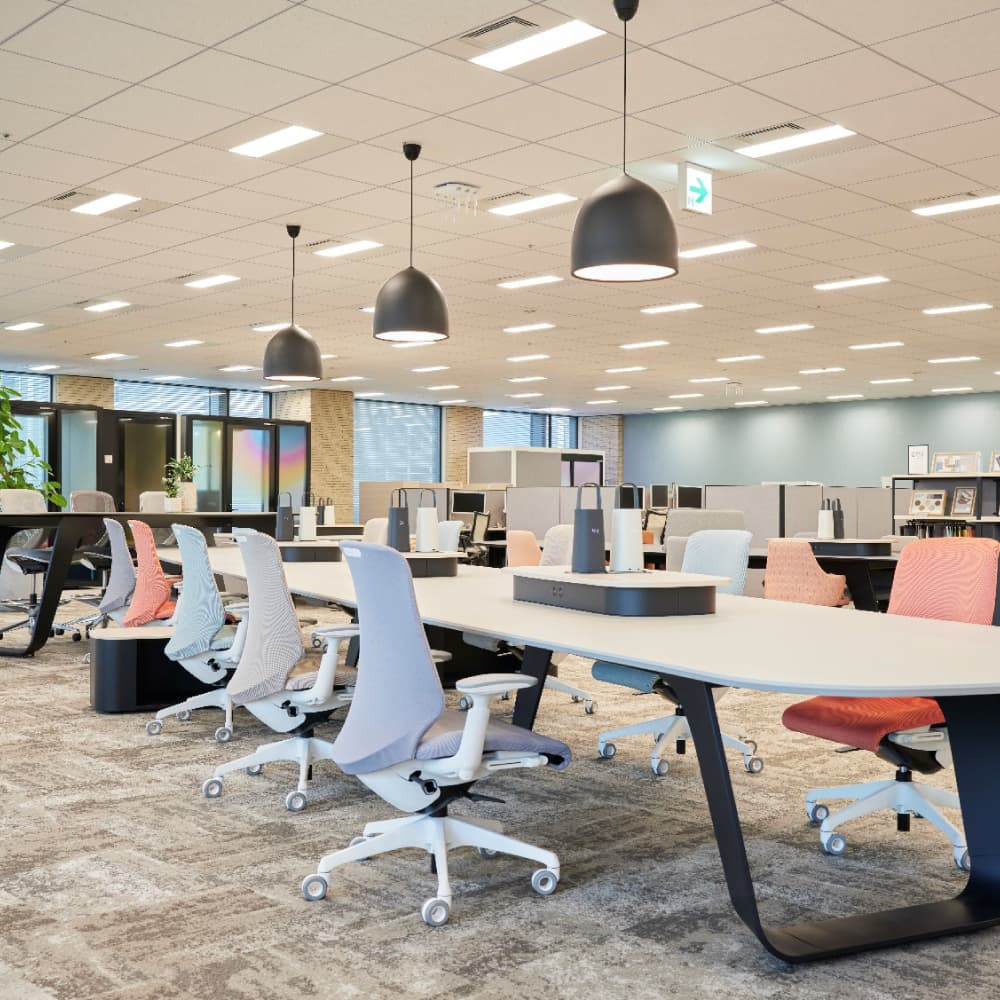 オカムラのショールームは、最新のオフィス家具や空間ソリューションを、実際の使用環境に近い形で体感できる場です。 チェアやデスク、収納といった基本アイテムに加え、パーティション、ワークブース、スペースを柔軟にデザインするモジュール家具など、働く場を構成する多彩な製品をご覧いただけます。