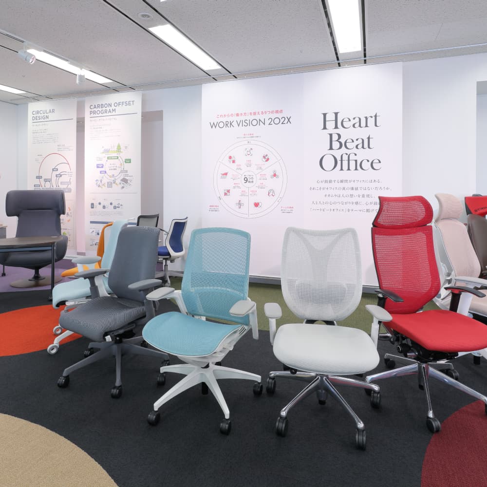 チェアやデスク、収納、ワークブース、柔軟にデザインできるモジュール家具など、オフィス家具のほか多彩な製品を実際の使用環境に近い形で体感できます。