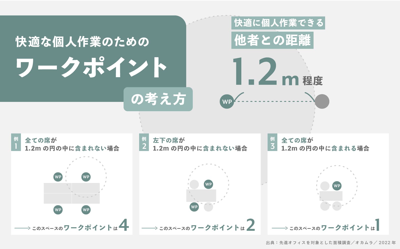 オカムラではワーカーが一定時間、快適に個人作業ができる席を「ワークポイント」と呼び、これを収容人数の目安とする考え方を提案しています。この考え方で重要なポイントとなるのが、他者との距離感です。そばに人がいると集中して仕事がしづらくなるため、ワークポイントは他者と適切な距離が保たれている必要があります。
