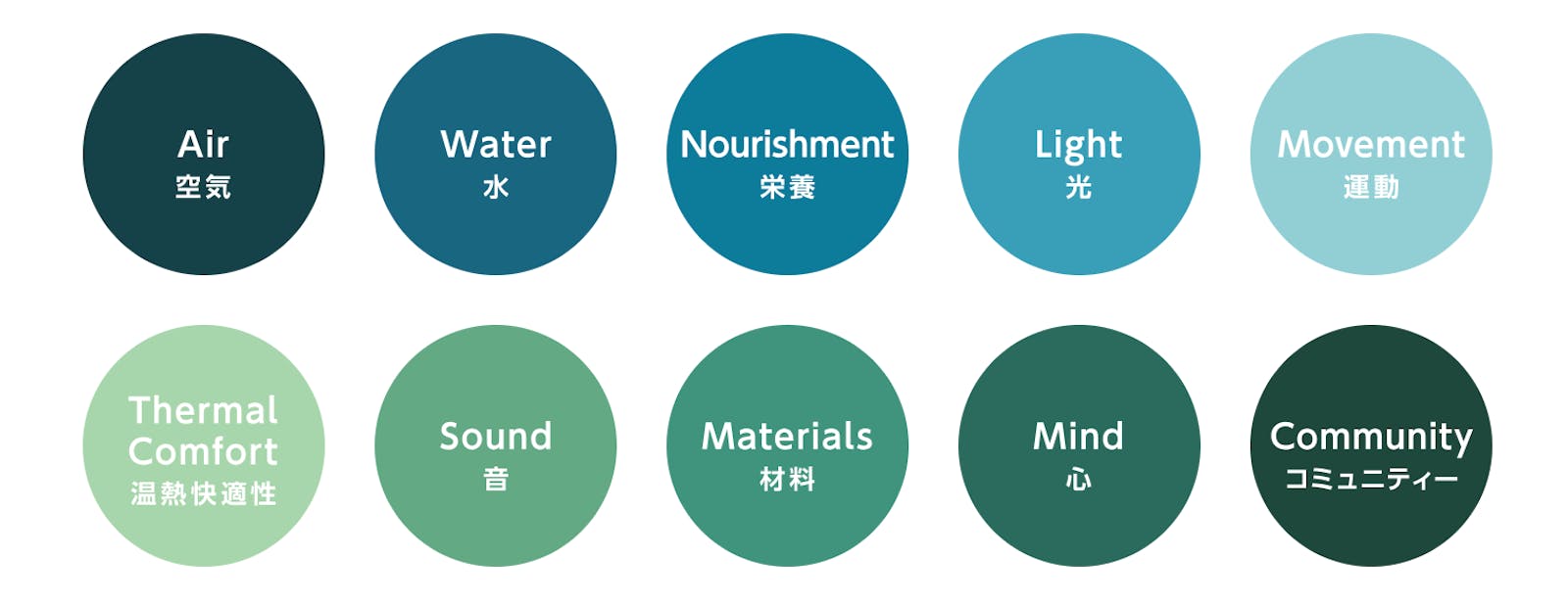 WELL認証では、「空気」「水」「栄養」「光」「運動」「温熱快適性」「音」「材料」「心」「コミュニティ」の10のコンセプトと、カーボンニュートラルへの姿勢などを評価する「イノベーション」が評価項目とされています。10のコンセプトはさらに、117の評価項目と225のパート(※1)に細分化され、各項目の合計得点で認証が取得できるか否かが決まります。