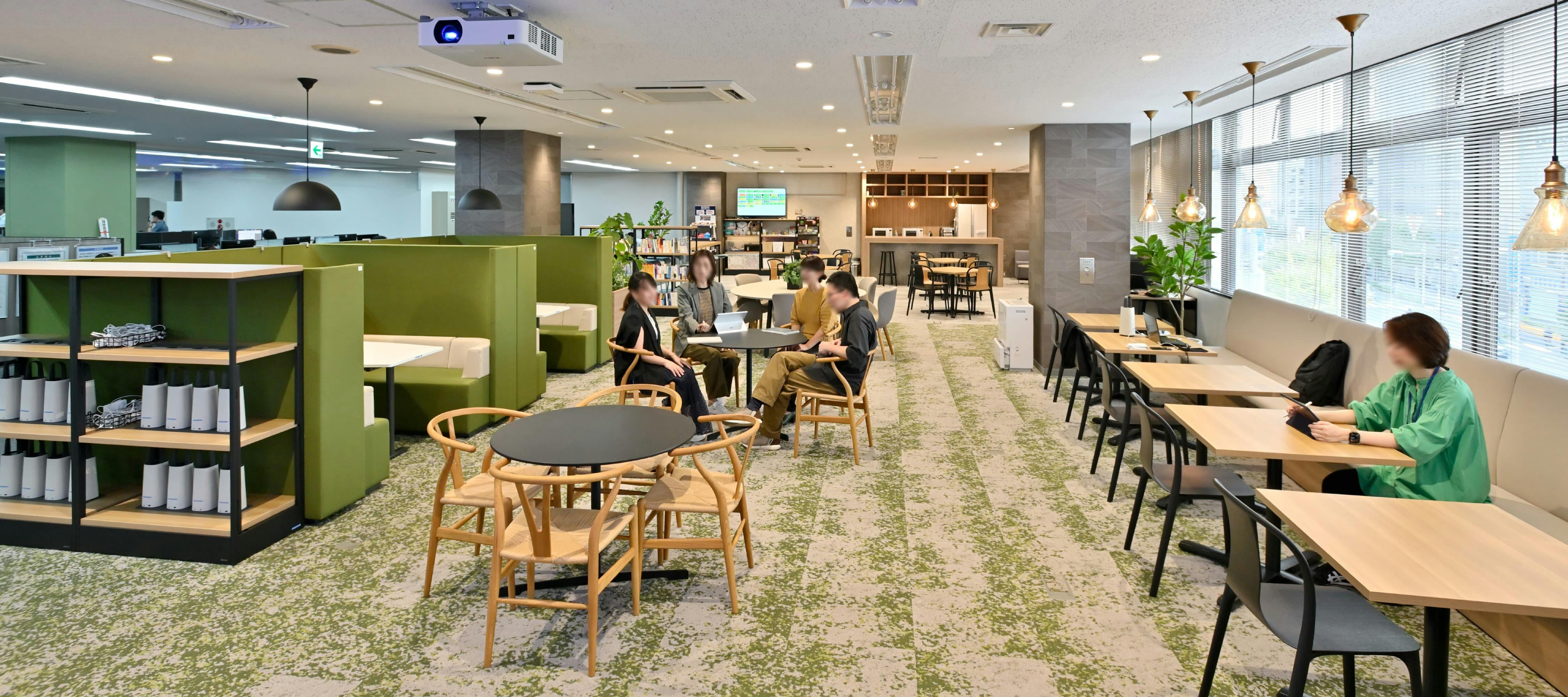 交流エリアは、奥まで視線が抜ける開放感あふれるスペースです。緑がまだらに織り込まれたカーペットが広がり、草原にいるようなやすらぎを感じられます。窓際には真鍮のペンダントライトがまろやかな光を落とし、ファミレス席には丸みのある照明が遊び心を添えています。住宅家具を取り入れたリラックスした雰囲気の中では、ランチや休憩のひとときに笑顔がこぼれ、会話も弾みます。時には打ち合わせや懇親会の場として、災害時には情報共有の拠点としても機能。人が集い、つながりが広がるオープンなコミュニケーションスペースです。