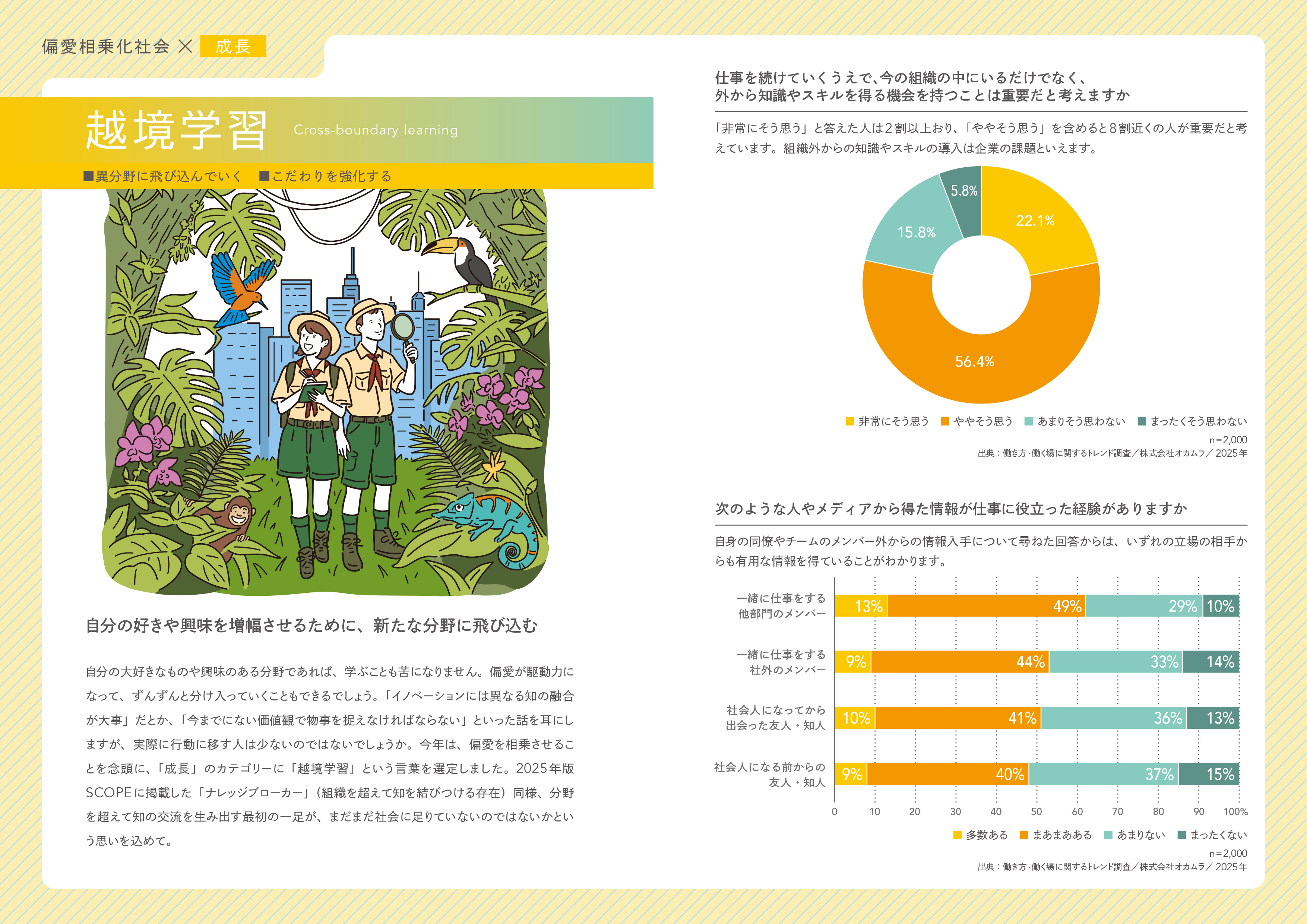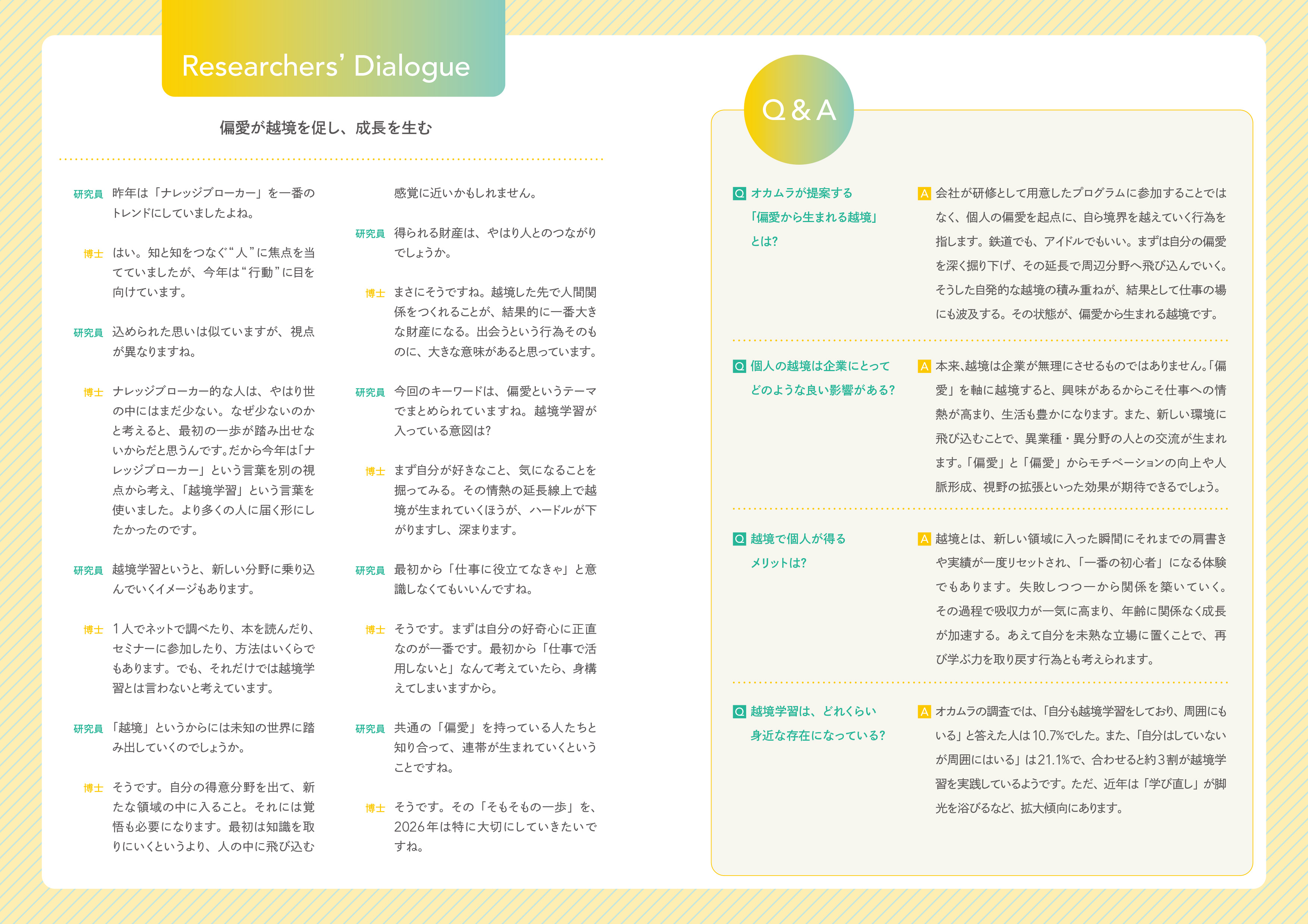 2026年の「はたらき方のトレンド」の4つのキーワード「越境学習」「感覚多様性」「スキルベース」「パートナーAI」を、関連するデータをもとに、ダイアログとQ&Aを通して深堀りしています。