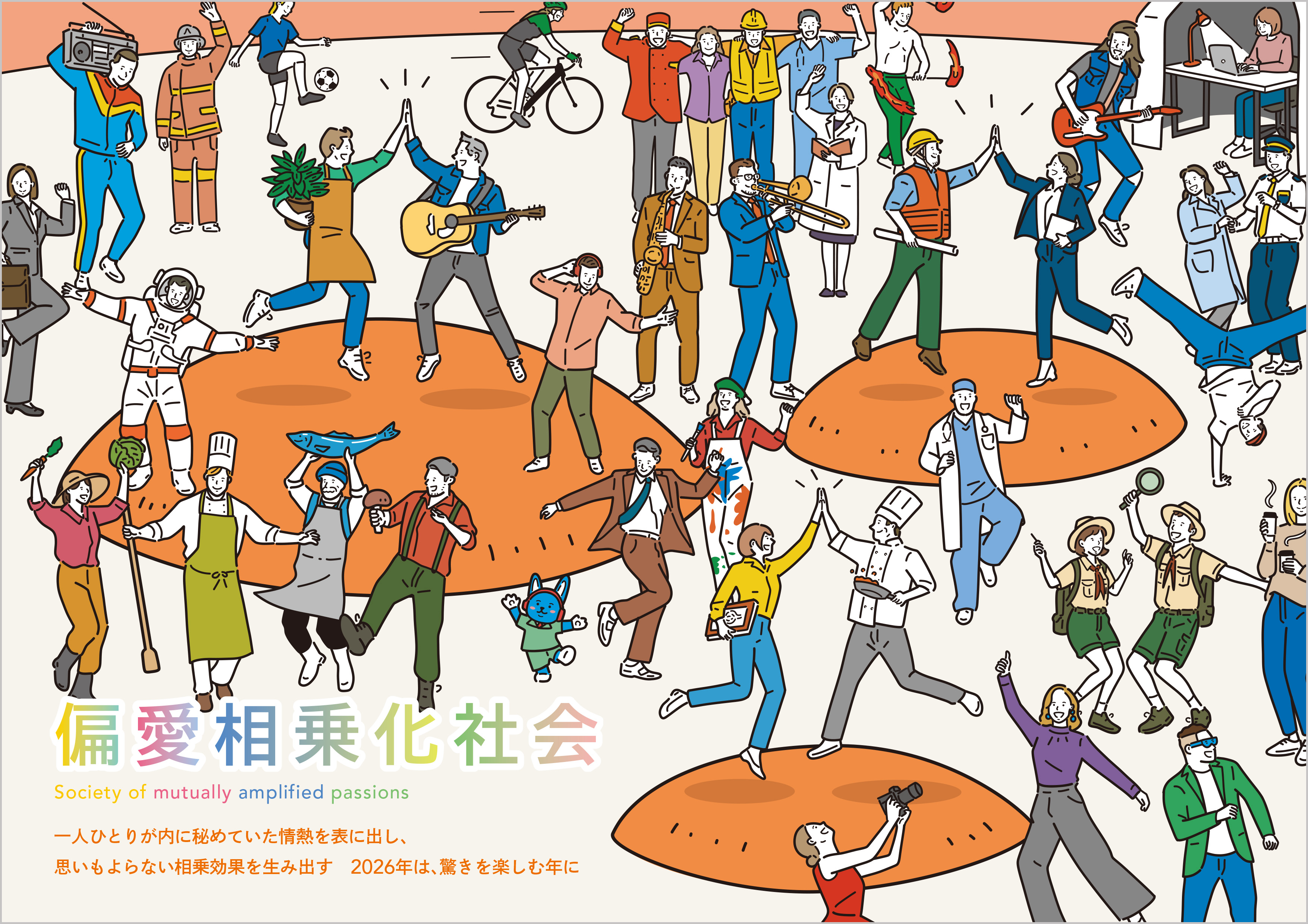 近年、「偏愛」という言葉が「好きなものに意識を集中することで、心や生活が豊かになる」という意味合いで使われることが増えています。オカムラが注目したのは、「偏愛」が生み出す情熱です。「誰が何と言おうとも、私はこれが好き」という思いの強さがパワーとなり、働く現場に投入された時に想像を超える素晴らしい成果が生まれるのではないかと考えました。また、「偏愛」が持つ力をどうやって結びつけるか、そして「相乗」させるかがこれからの働く現場に大事なことです。個人が仕事にかける情熱をどうやって集めて相乗効果を生み出すか。2026年はそんな取り組みを始める年になるはずです。