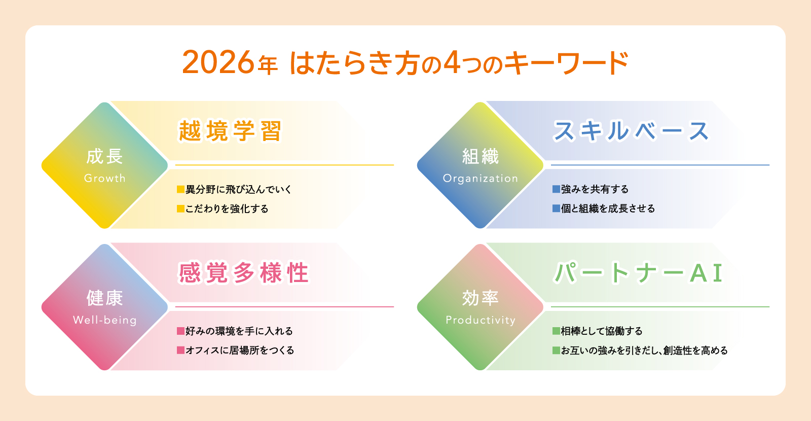 2026年のはたらき方を考えるカテゴリーとして、「成長」「健康」「組織」「効率」の4つを設定しました。そこに「偏愛相乗化社会」を掛け合わせ、「越境学習」「感覚多様性」「スキルベース」「パートナーAI」という4つのキーワードを抽出し、2026年のはたらき方のトレンドとして位置づけました。