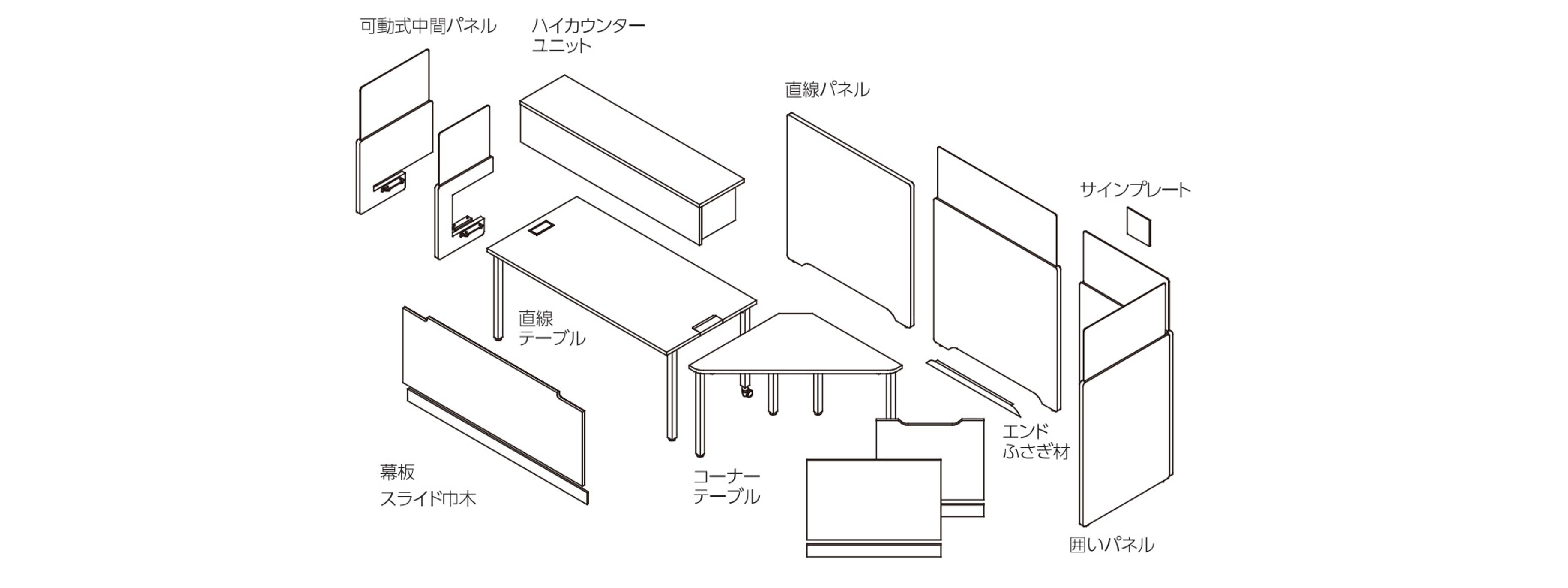 本体天板・パネル・ハイカウンターユニットには、公共性の高い場所でニーズの高い、抗菌・抗ウイルス性能メラミン化粧板を採用しています。可動式中間パネルは、高い自由度で取り付けることができるため、プライバシーに配慮した窓口の数を容易に増減できます。L字型の囲いパネルを追加設置すると、視線が遮られより落ち着いた空間になります。