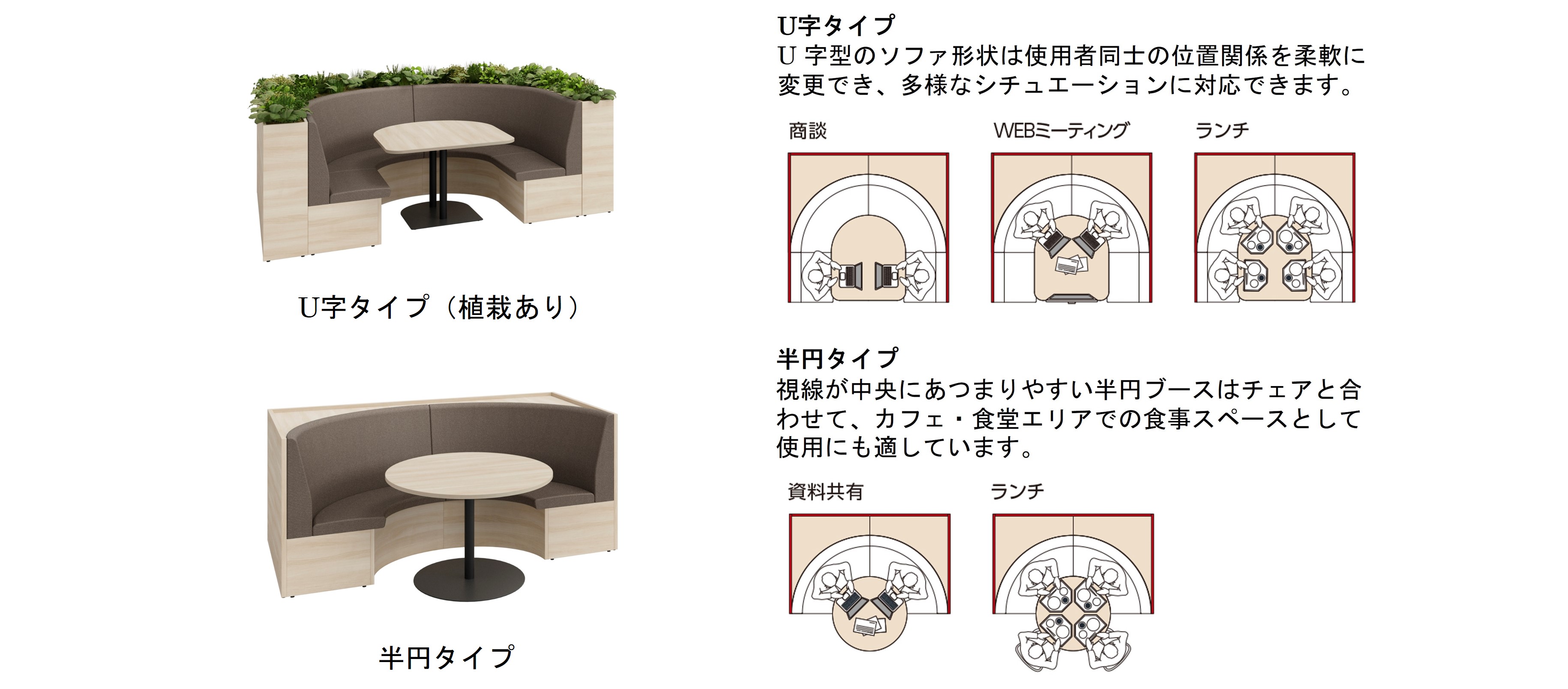 サイズ:U字タイプ2800W×2100D×1000/1460H、U字タイプ用テーブル1200W×1050D×720H、半円タイプ2260W×1400D×1000/1460H、半円タイプ用テーブルΦ1050×720H(mm)
