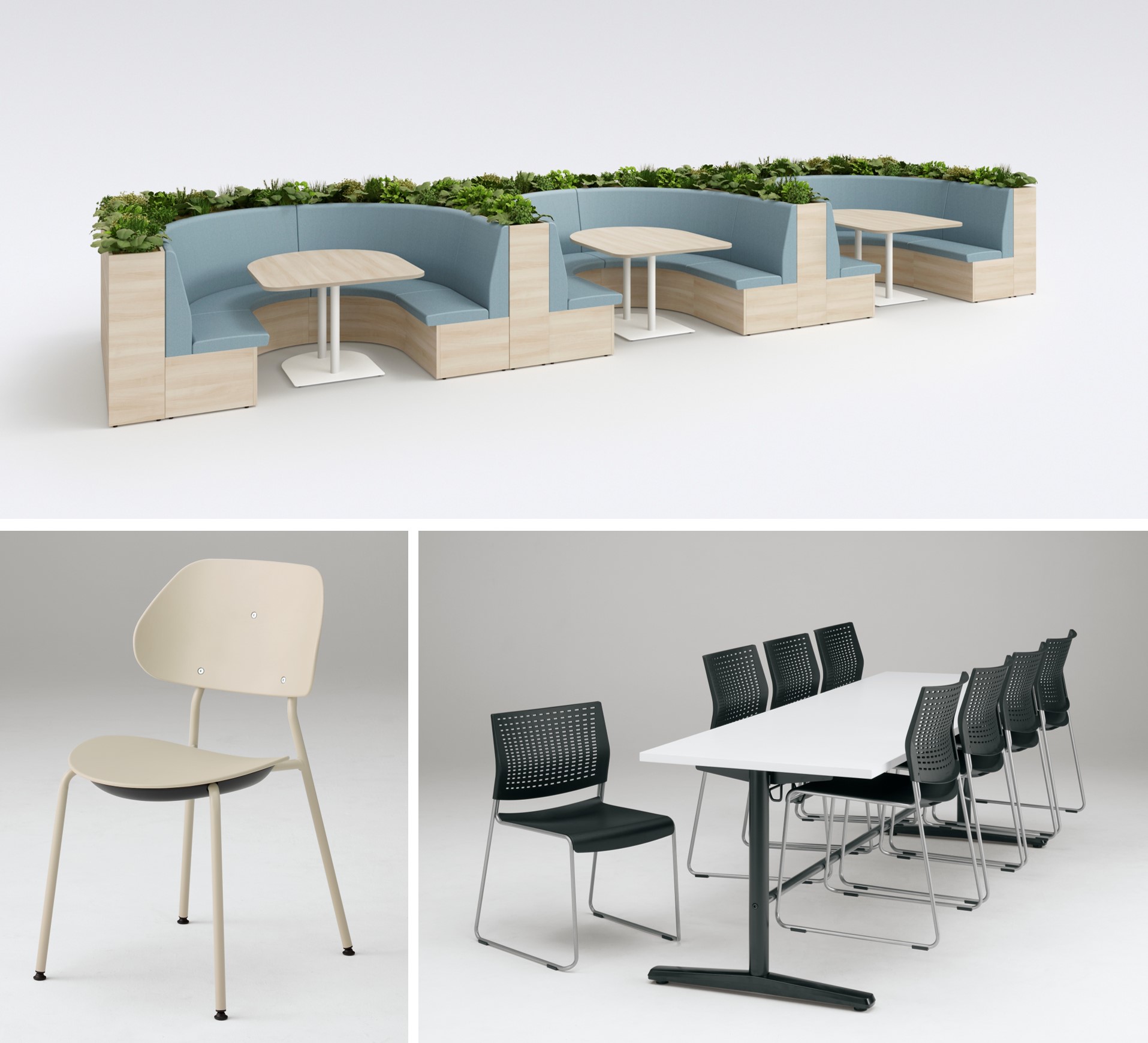 ユニットソファシリーズ「Bresta(ブレスタ)」U字ブースセット、カフェチェアシリーズ「Amita(アミタ)」樹脂タイプ、「Lives Meeting Table(ライブスミーティングテーブル)」ハンギングタイプ