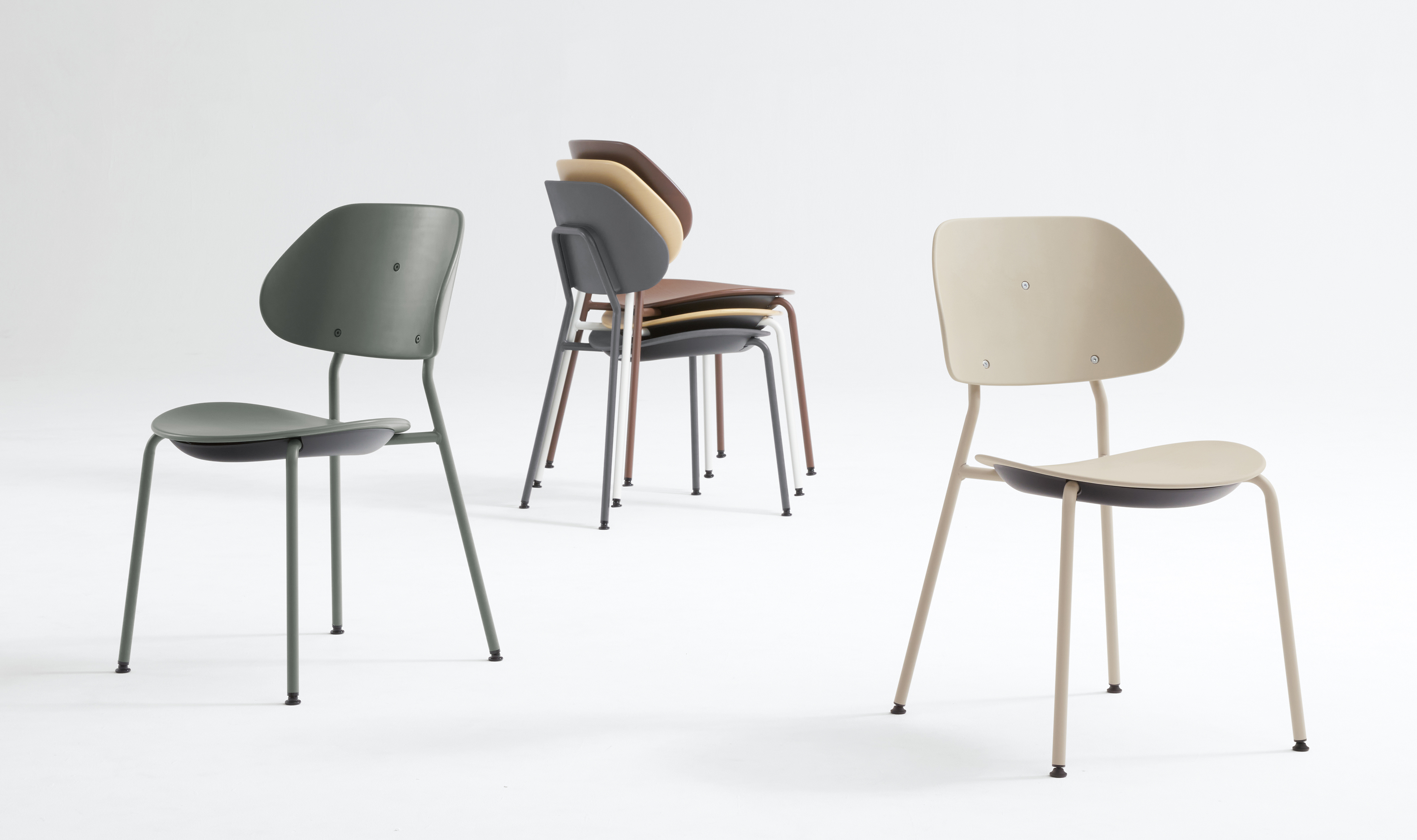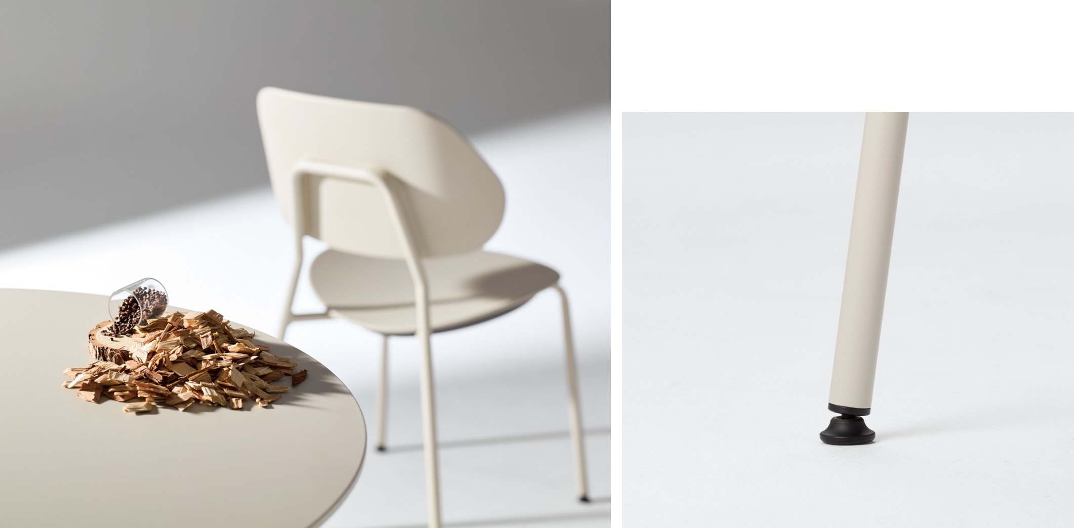 「Amita」は、カジュアルな空間に調和する柔らかいフォルムで、脚タイプのバリエーションが豊富なカフェチェアです。背と座に合板を使用した従来の合板タイプに加え、背と座に木粉配合樹脂を使用した樹脂タイプを新たにラインアップし、2026年1月より発売します。木粉配合樹脂は、木が成長過程で二酸化炭素を吸収するため二酸化炭素排出量の削減に貢献し、木粉のつぶ感を感じる温かみのある風合いを演出します。また、樹脂タイプは、合板タイプと比較して約600gの軽量化を実現しました。さらに、イスの動かしやすさや動かす際に出る音の改善のために、合板タイプと樹脂タイプどちらも脚端の材質を変更して改良を行いました。座はクッションにすることも可能です。イスの移動や立ち座りする機会が多い食堂やカフェ空間での取り回しがより快適に行えます。
