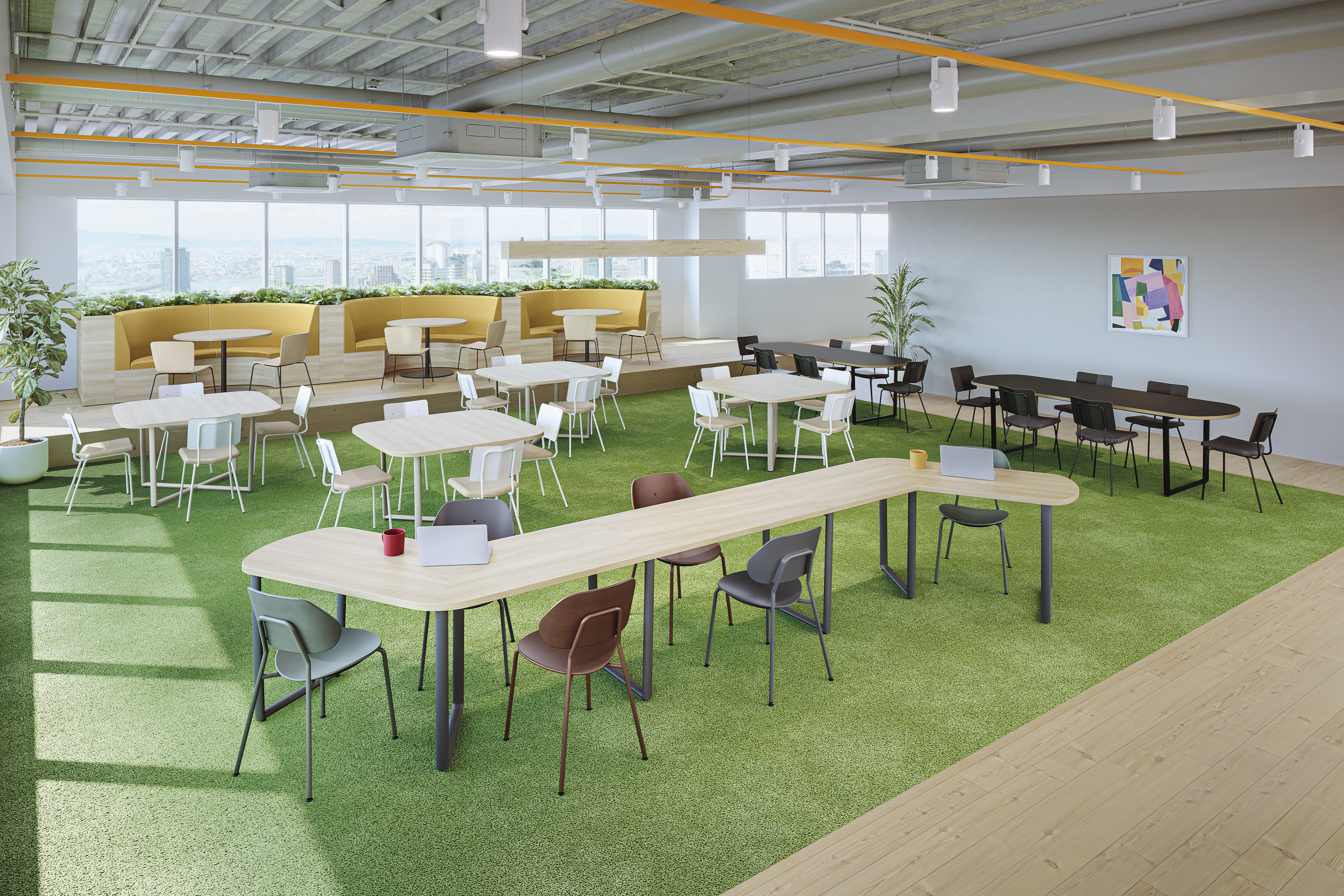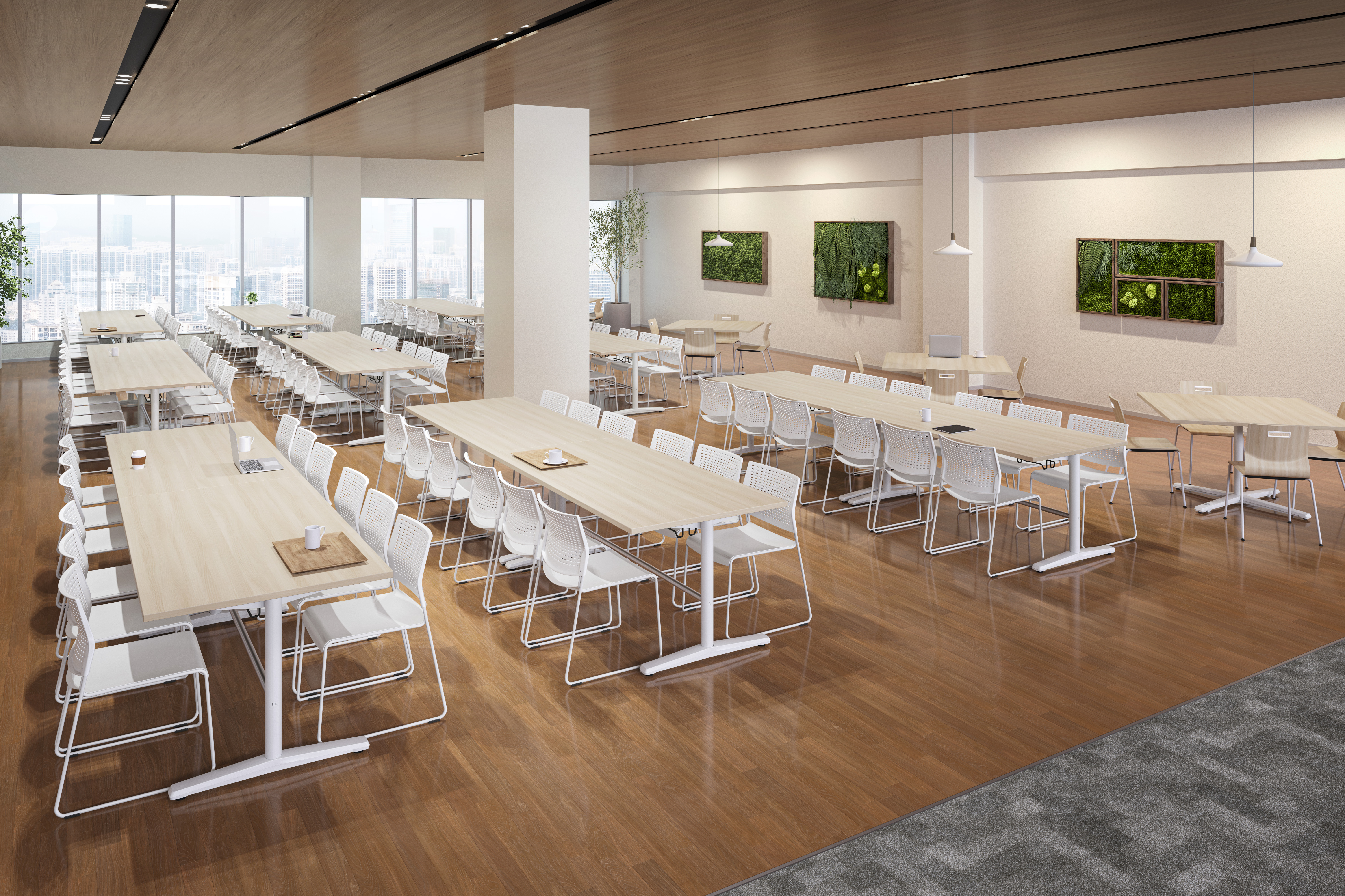 オカムラでは、コミュニケーションの促進、シーンに合わせた選択性を持たせる、企業らしさをアピールする、社員それぞれが食堂に求める要望を実現するといったテーマをもとに、食堂空間を提案しており、それを実現するためのさまざまな製品を開発しています。