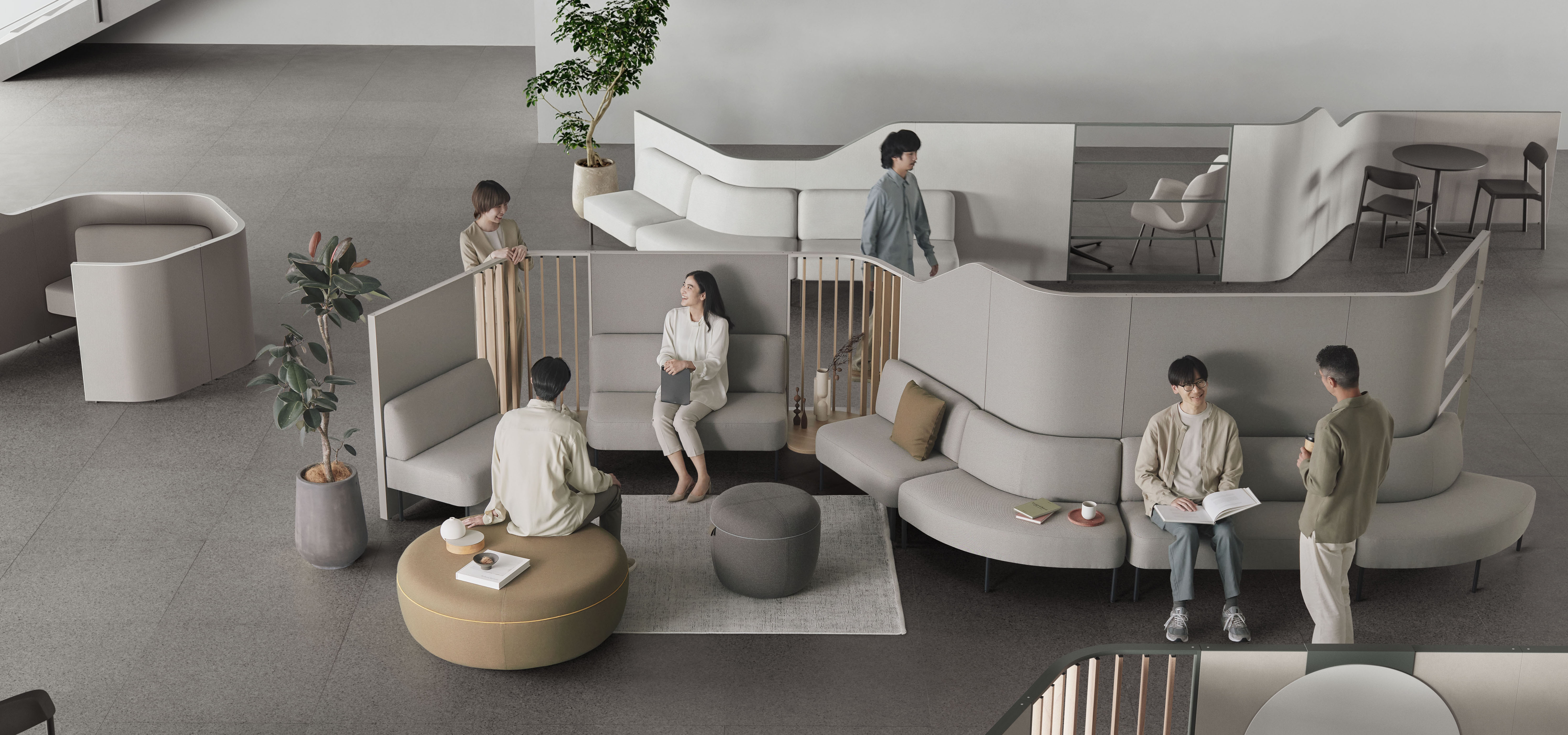 オカムラでは、コミュニケーションを生みだすことをコンセプトとした製品の新しいカテゴリとして、「Blending Furniture(ブレンディングファニチュア)」を設定しました。複数の個性を混ぜ合わせて新たな力を生み出すという意味を込めています。ブレンディングファニチュア「YAA」は、曲がったり高さに段差を付けたりしたパネルに、ソファやテーブルを組み合わせて、柔らかな曲線と高さの変化で空間に動きをつくり、人が自然に集まりやすい流れを生み出します。