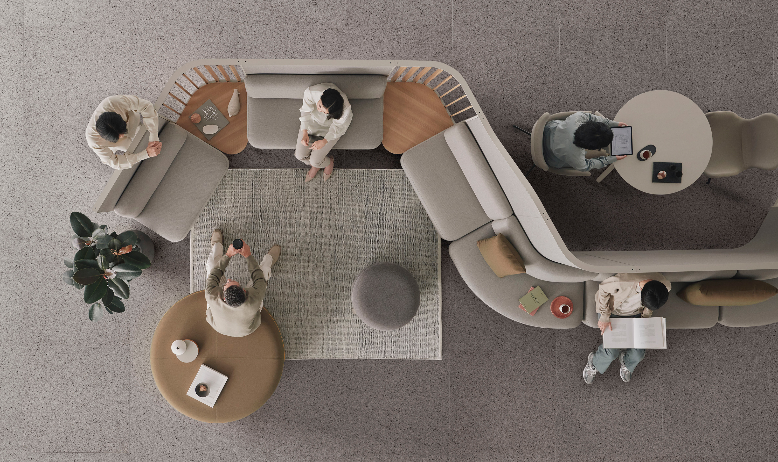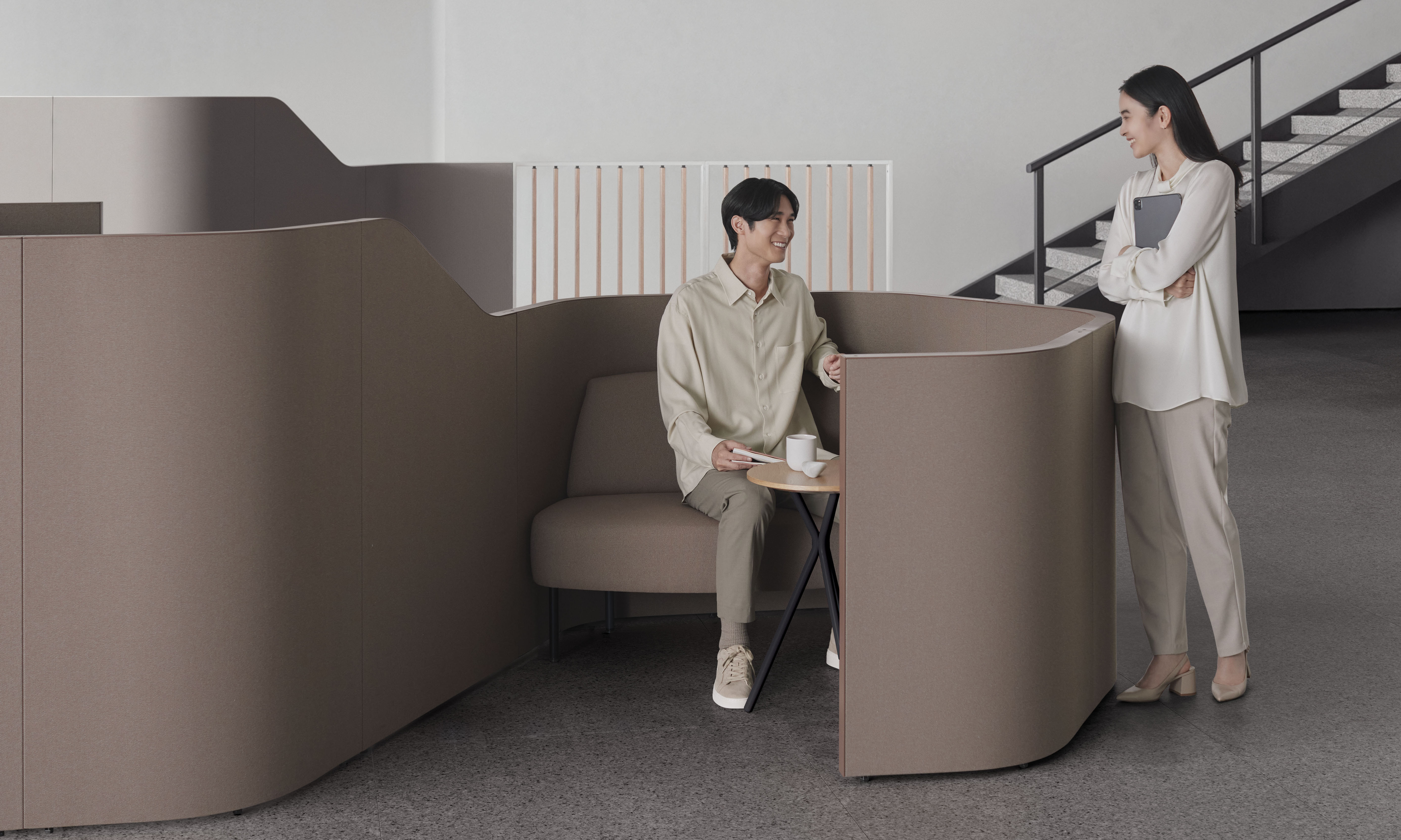 仕事の相談や打ち合わせの続き、気分転換の雑談もできそうな、ほどよい仕切りが落ち着いた雰囲気をつくり、人が集まりやすい交流の場を生み出します。