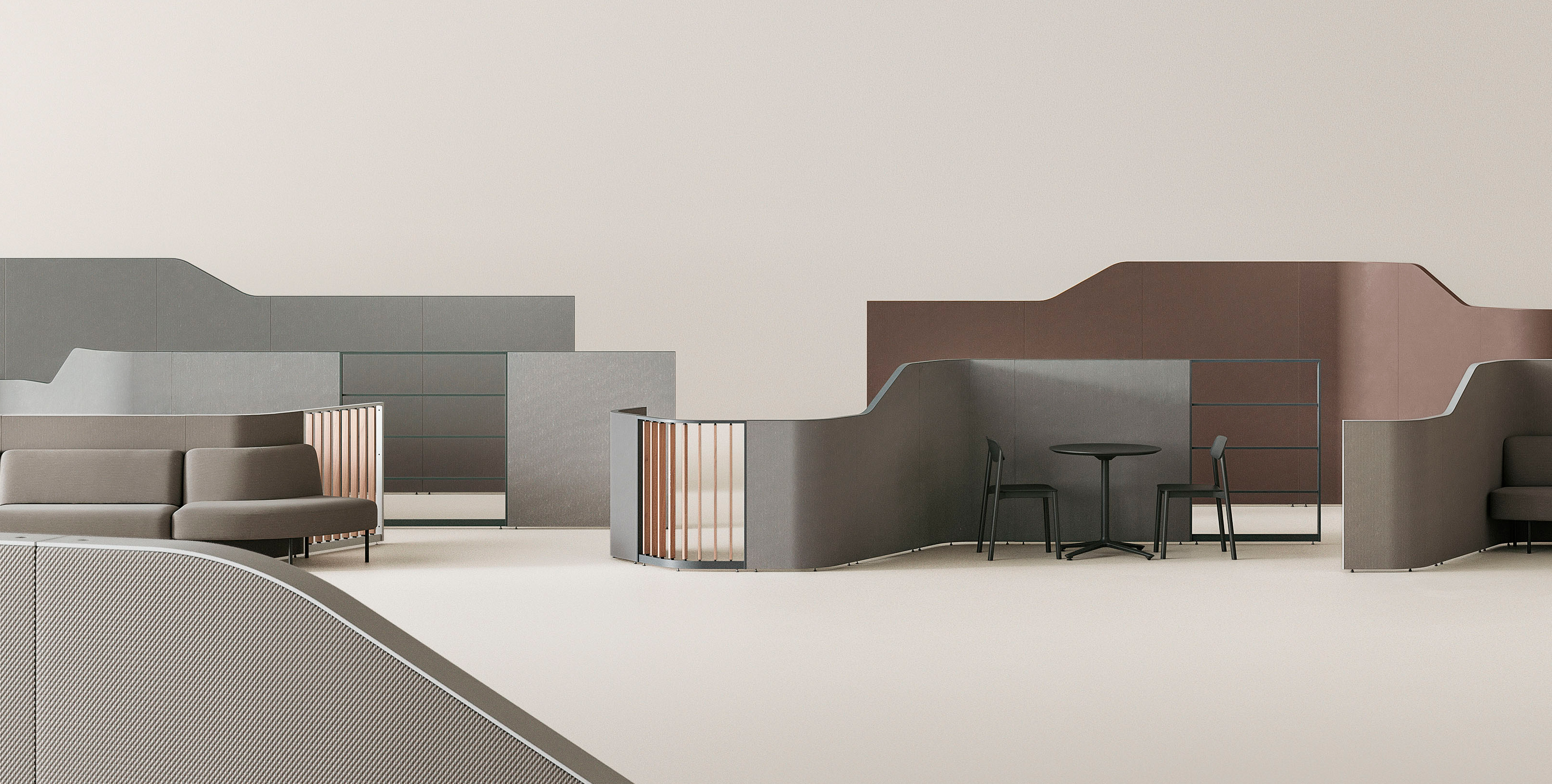 パネルはストレート、90度・120度の曲線状、ゆるやかなラウンド状、両端で高さが違う段差状の5種で、それぞれ高さ違いをラインアップしているため、さまざまな組み合わせにより空間を自在に構成することが可能です。パネルの組み替えが可能なため、働き方やオフィスの変化に合わせて長く使い続けることができます。パネルのトップカバーやエンドカバーは薄く仕上げ、巾木やスリットもなくし、すっきりとしたミニマルなデザインです。カラーは、働く人やインテリアを引き立てる上質な背景となるように、空間に馴染みやすく落ち着いたトーンでそろえています。