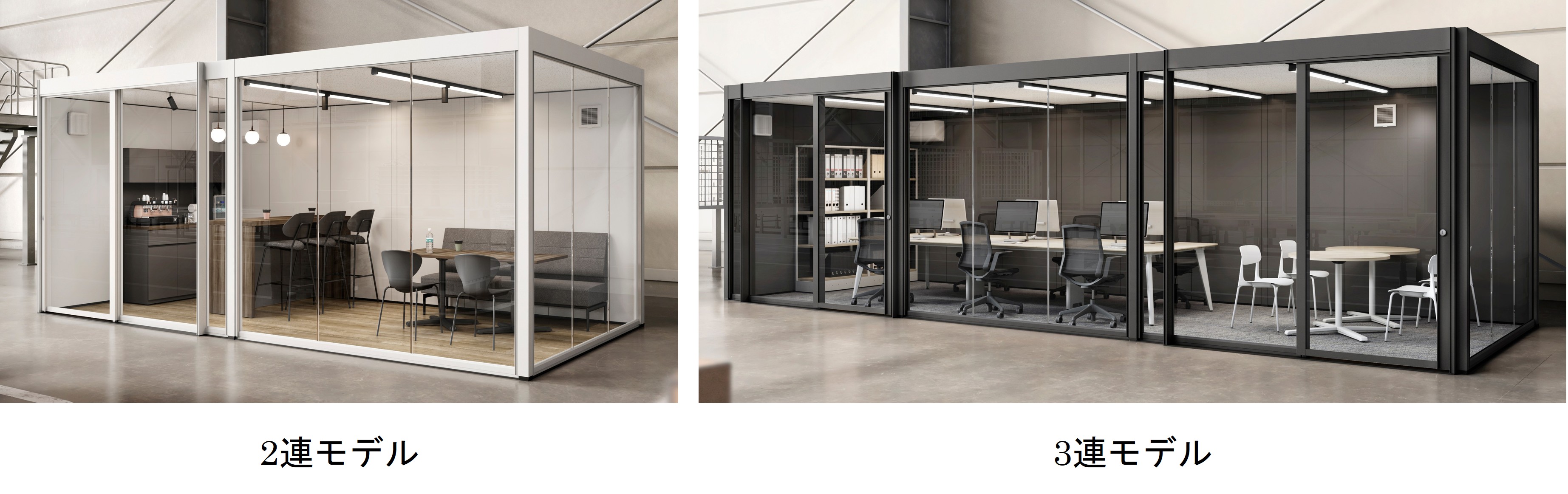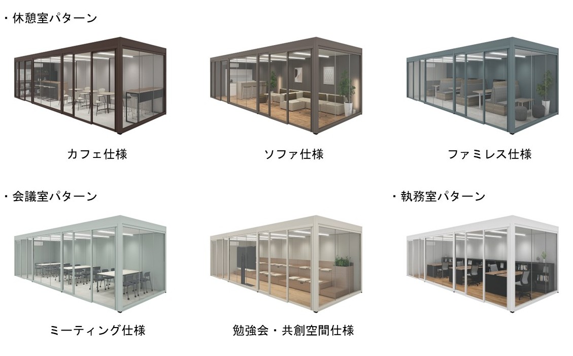 サイズ展開は2種類でモジュール化しているため仕様選択が簡単です。建築工事を伴う休憩室設置と比較して短い工期で設置が可能なため、工場の稼働への影響を最小限にとどめます。ルーム内は什器レイアウトの自由度が高く、カフェカウンターやハイテーブル、ファミレスブースなどを設置した休憩室パターン、ミーティングテーブルとチェアを設置した会議室パターン、デスクとタスクシーティングを設置した執務室パターンなど多様な用途に活用できます。居心地が良く機能的な「はたらき心地」をかたちにするオフィスファニチュア「Lives(ライブス)」シリーズのひとつとしてラインアップしており、さまざまなスタイルのワークプレイスを「Lives」シリーズで構築することが可能です。