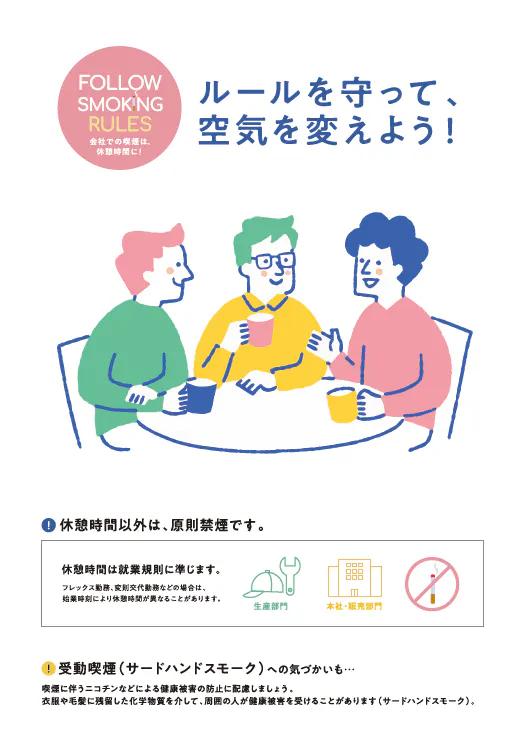 「就業時間内禁煙」のルールと目的を可視化し、社内の受動喫煙防止への意識向上を図っています。