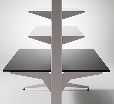 天板面の最大積載質量は150kg、棚板の最大積載質量は100kgです(等分布質量)。実験に必要な大型機器や複数の機器を設置するときも、しっかりと安定した状態でお使いいただけます。
