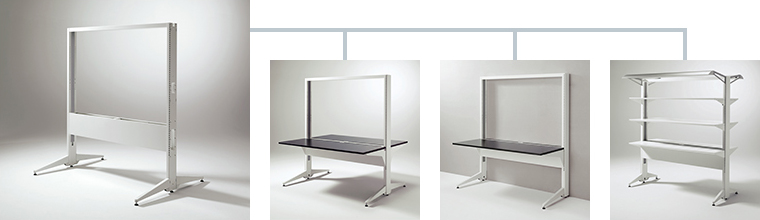 基本となるコアフレームに、使い方に応じたタイプの脚、さらに豊富なオプションパーツを組み合わせることで、自由自在なカスタマイズが可能。拡張性にすぐれ、組み替えも簡単におこなえます。