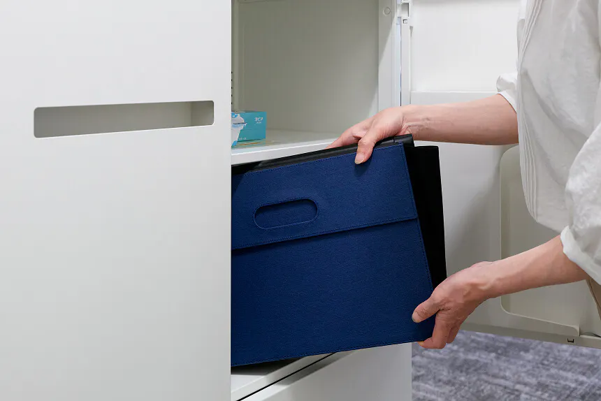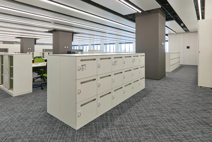 ワゴンレスの運用によって個人の収納スペースが限定され、紙利用の縮小につながります。また、フリーアドレス導入に合わせた将来的な書類の共有化・電子化にも移行しやすくなります。