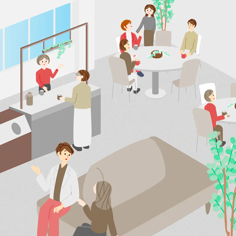 業務の合間に休息や気分転換ができるスペースを設けることで、職員の心身の健康に寄与します。