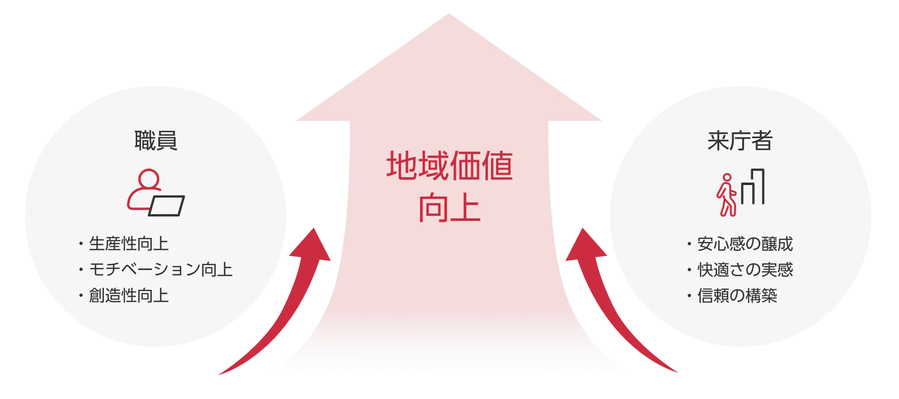 職員と来庁者双方のウェルビーイングが高まることで、行政サービスの質はより高まり、相互の信頼と協働の土台が築かれます。こうした好循環は、地域の魅力や暮らしやすさを向上させ、持続的な地域価値の創造へとつながっていきます。