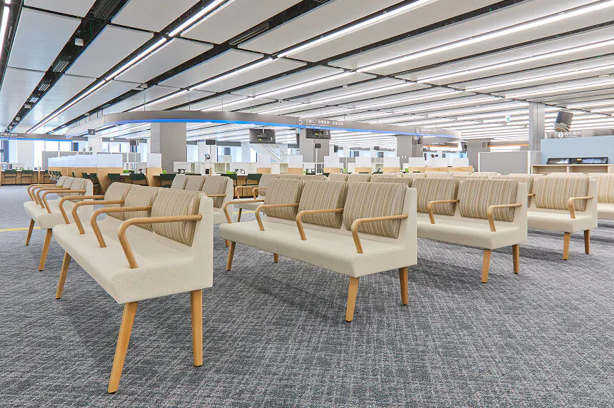 疲れにくく立ち座りしやすい椅子の採用や、落ち着いて過ごせる休憩スペースの設置により、待ち時間や手続きに時間を要する場合でも快適に過ごせるよう配慮します。