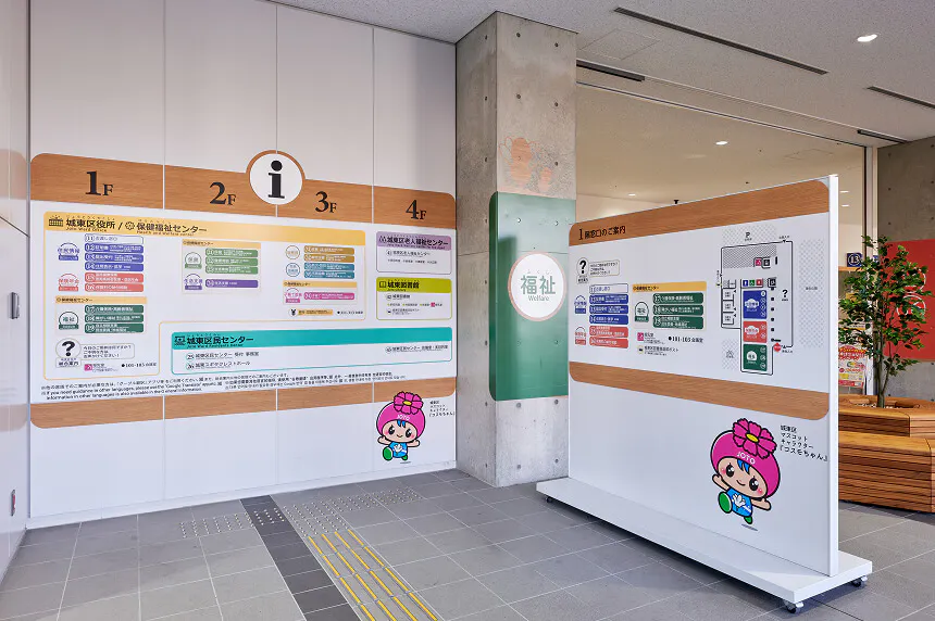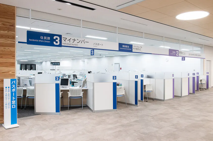 外国語対応や多言語表示、キッズスペースの設置、十分な通路の確保などにより、外国人やお子様連れの方、車椅子利用者などさまざまな来庁者に配慮します。