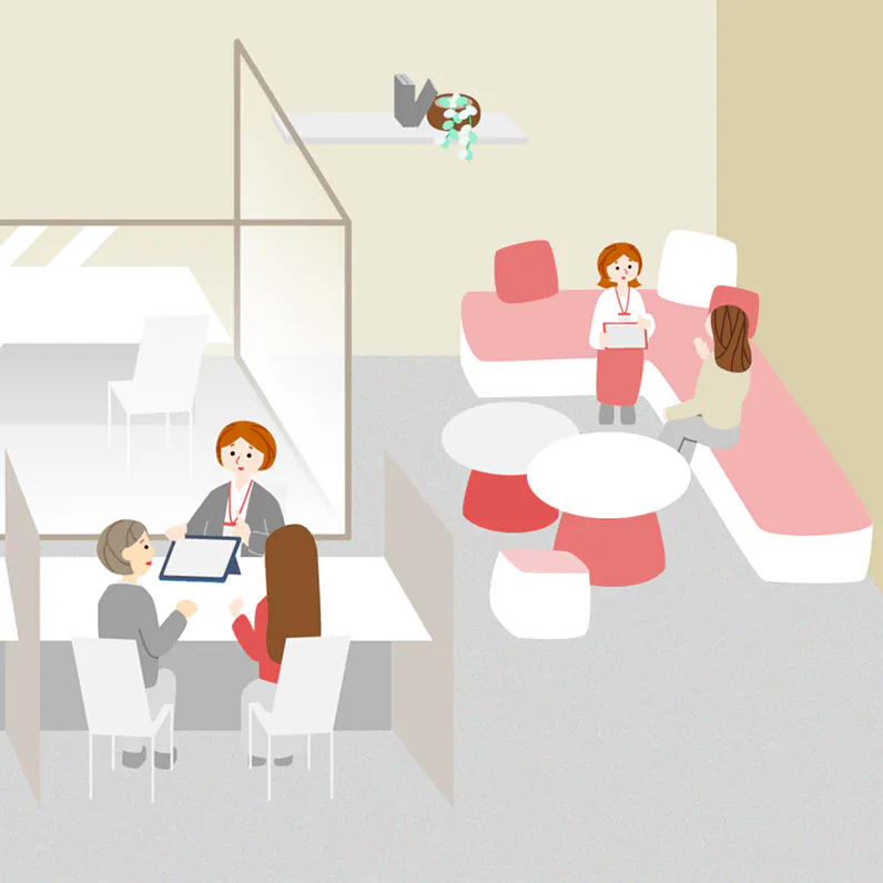 リラックスしながら落ち着いた雰囲気で相談できるソファーブースの設置。