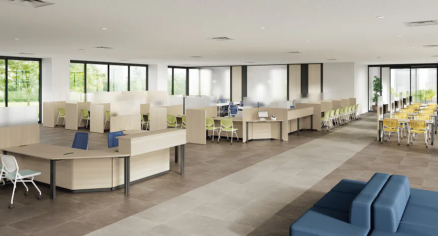 これからの窓口は、オンライン申請の普及に伴い、必要となる窓口数が減少するとともに、業務の中心が手続き対応から相談業務へと移行していくと考えられます。こうした変化に柔軟に対応するためには、窓口カウンターや相談テーブルなど多目的に活用できる、可変性の高い什器の導入が有効です。このような什器を設置することで、環境の変化や用途に応じて形態を変えることができ、日々変化する行政サービスに最適化した窓口空間を構築できます。