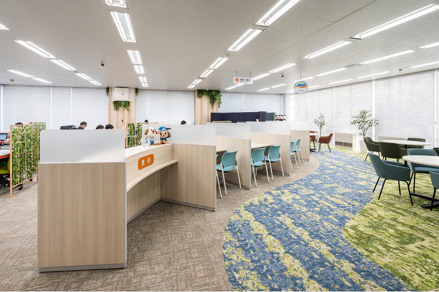 カーペットの色分けによって窓口と通路のセキュリティーラインを明確にすることで、利用者の動線が分かりやすくなり、誤って立ち入ることを防止。