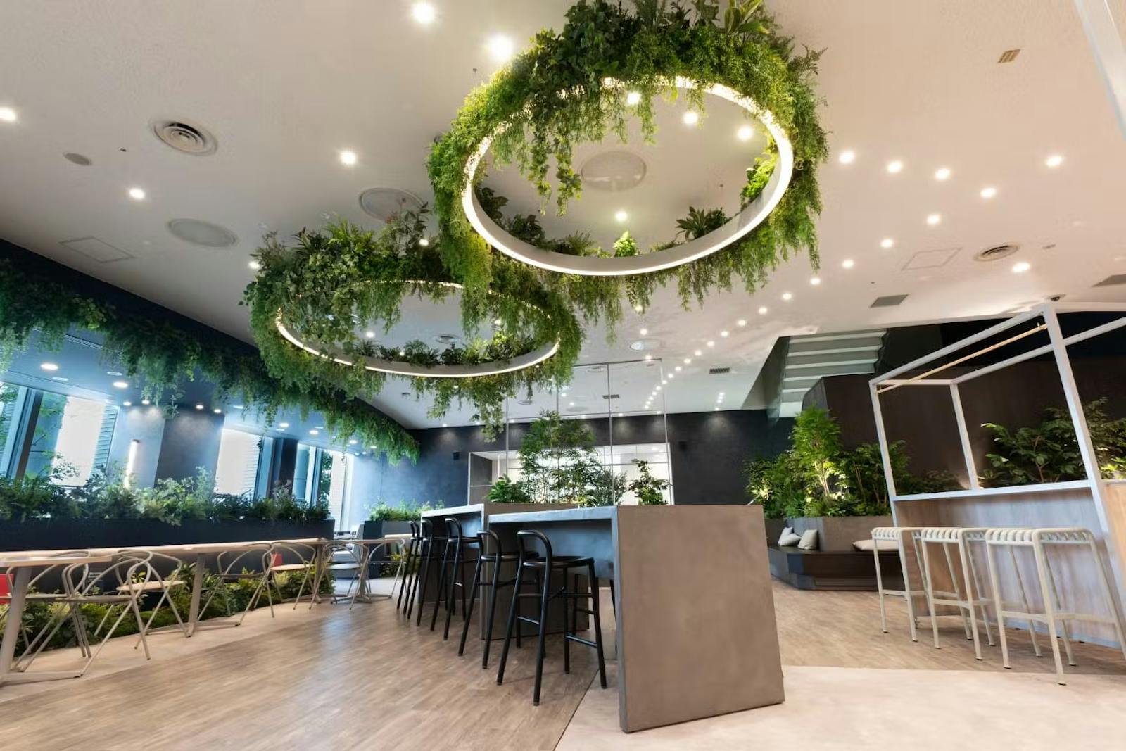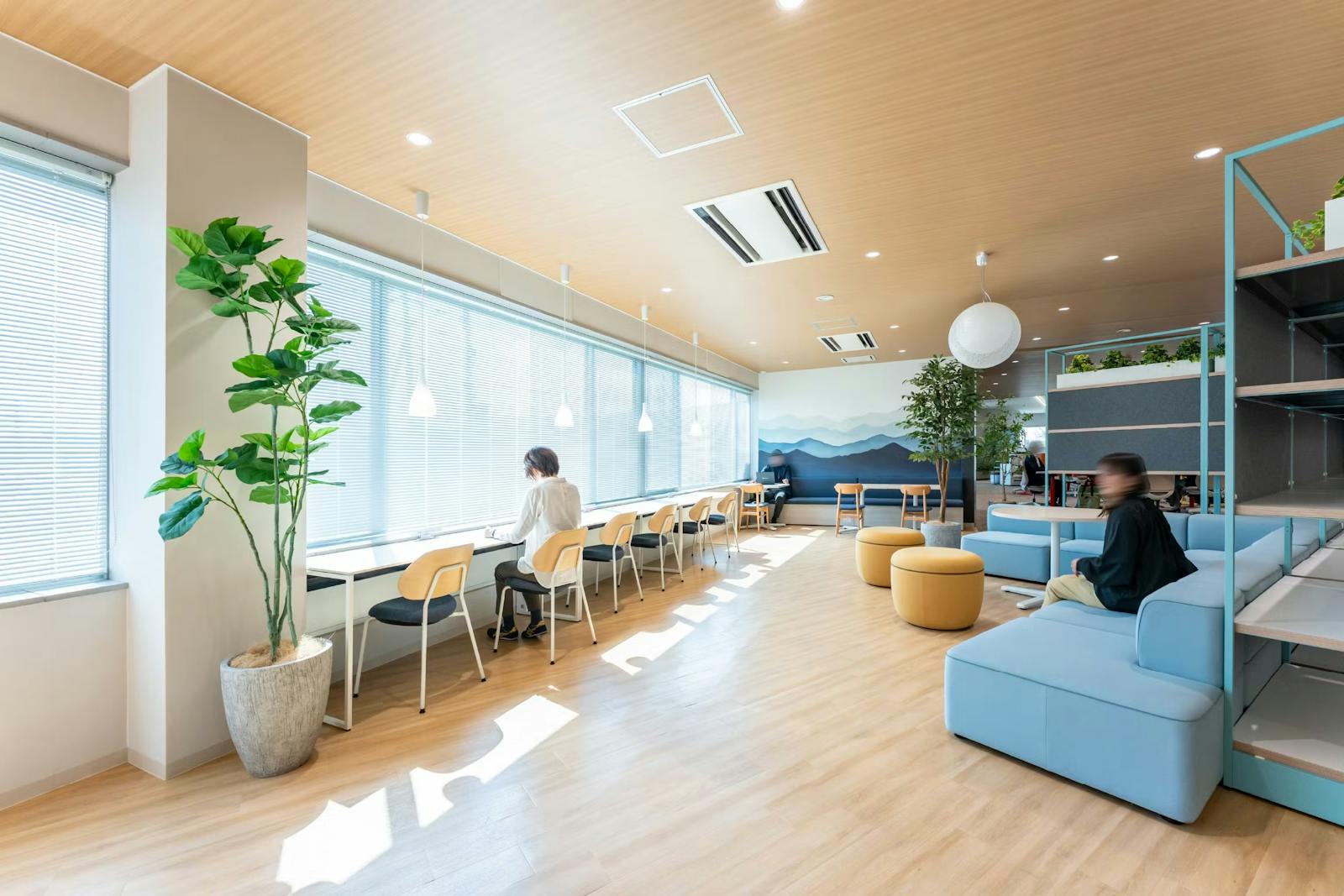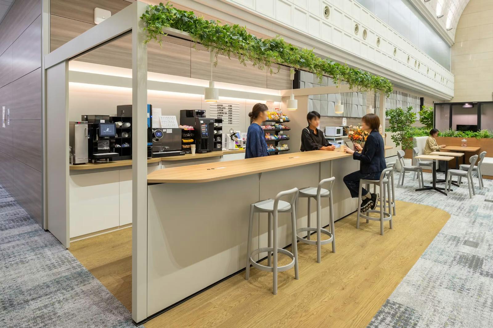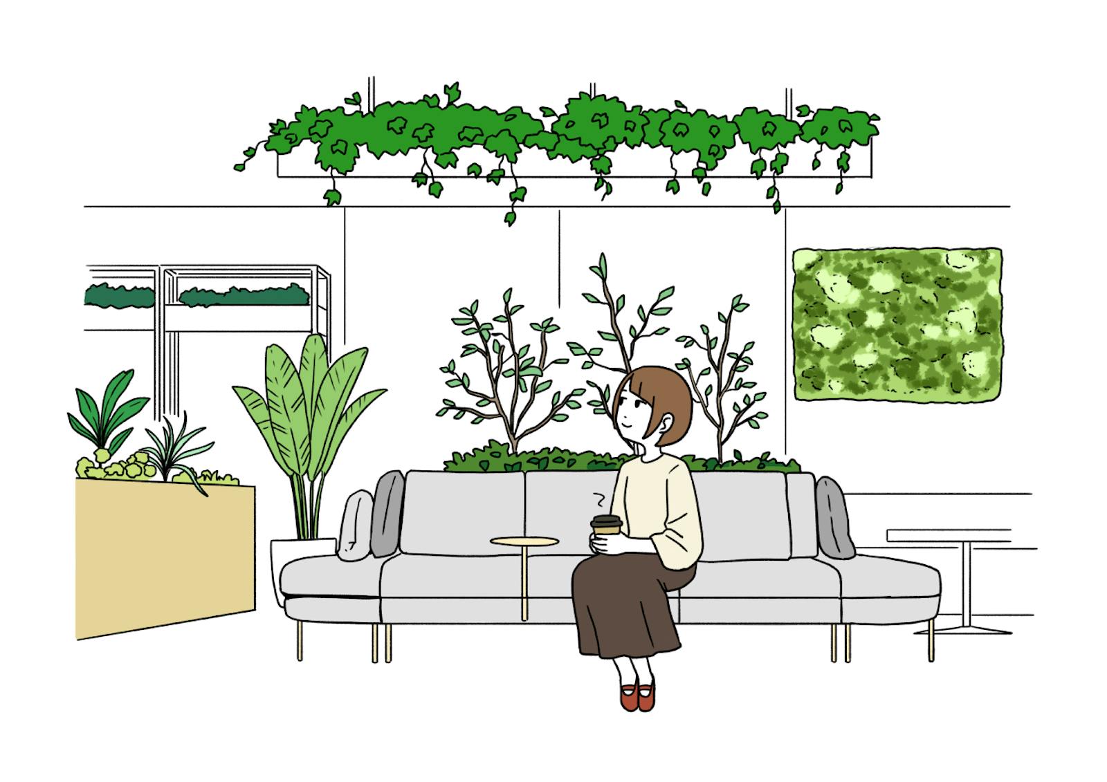 - 梁を活かしたグリーン装飾で、リフレッシュスペースに自然な温かみをプラス