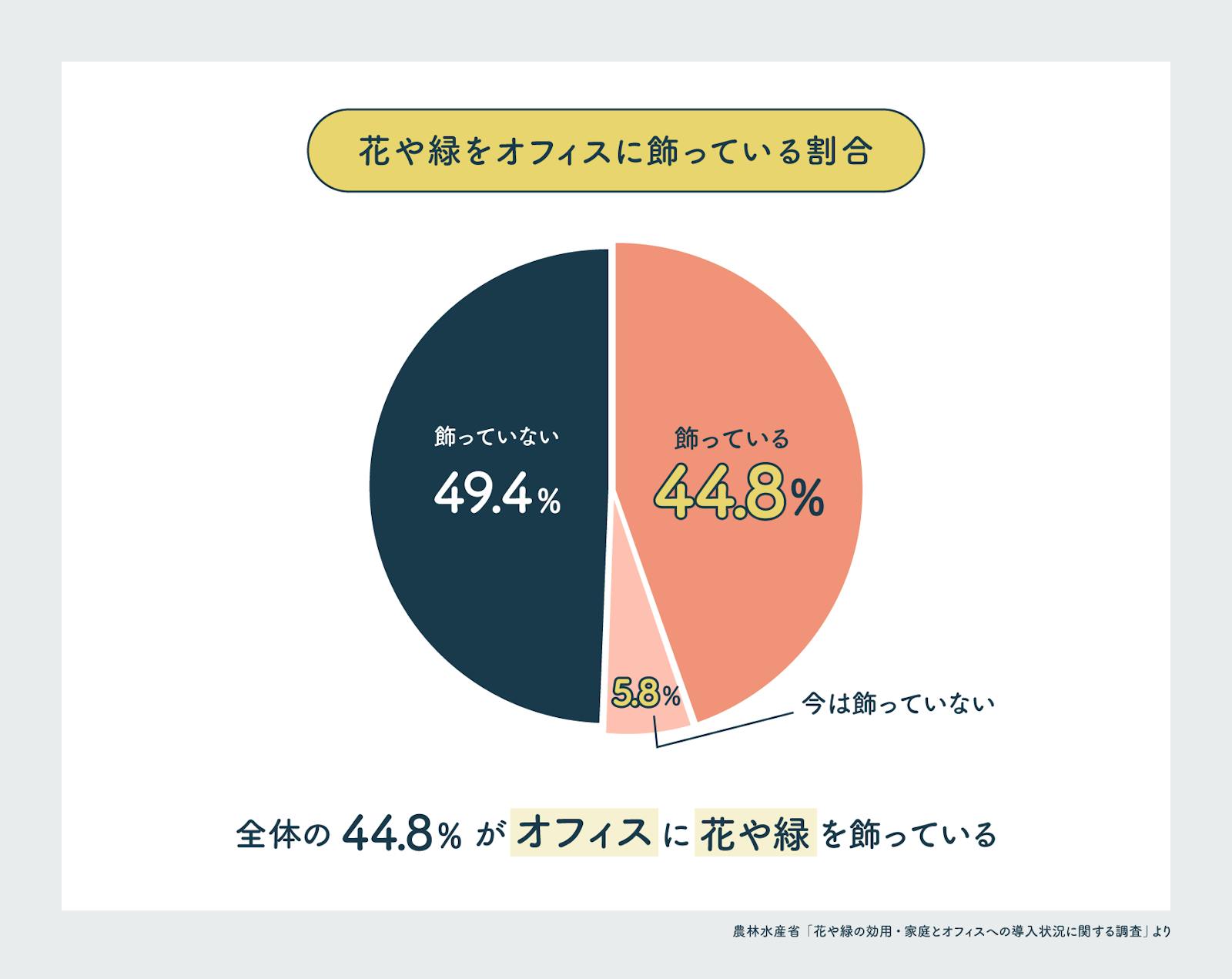 働き方やオフィス環境の多様化が進む中で、心地よく働ける空間づくりへの関心が高まっています。その一環として、リラックス効果や集中力の向上を目的に、オフィスに植物を取り入れる企業が増えているのです。農林水産省が2020年に実施した「花や緑の効用・家庭とオフィスへの導入状況に関する調査」によると、オフィスに植物を導入している企業は全体の約44.8%にのぼります。