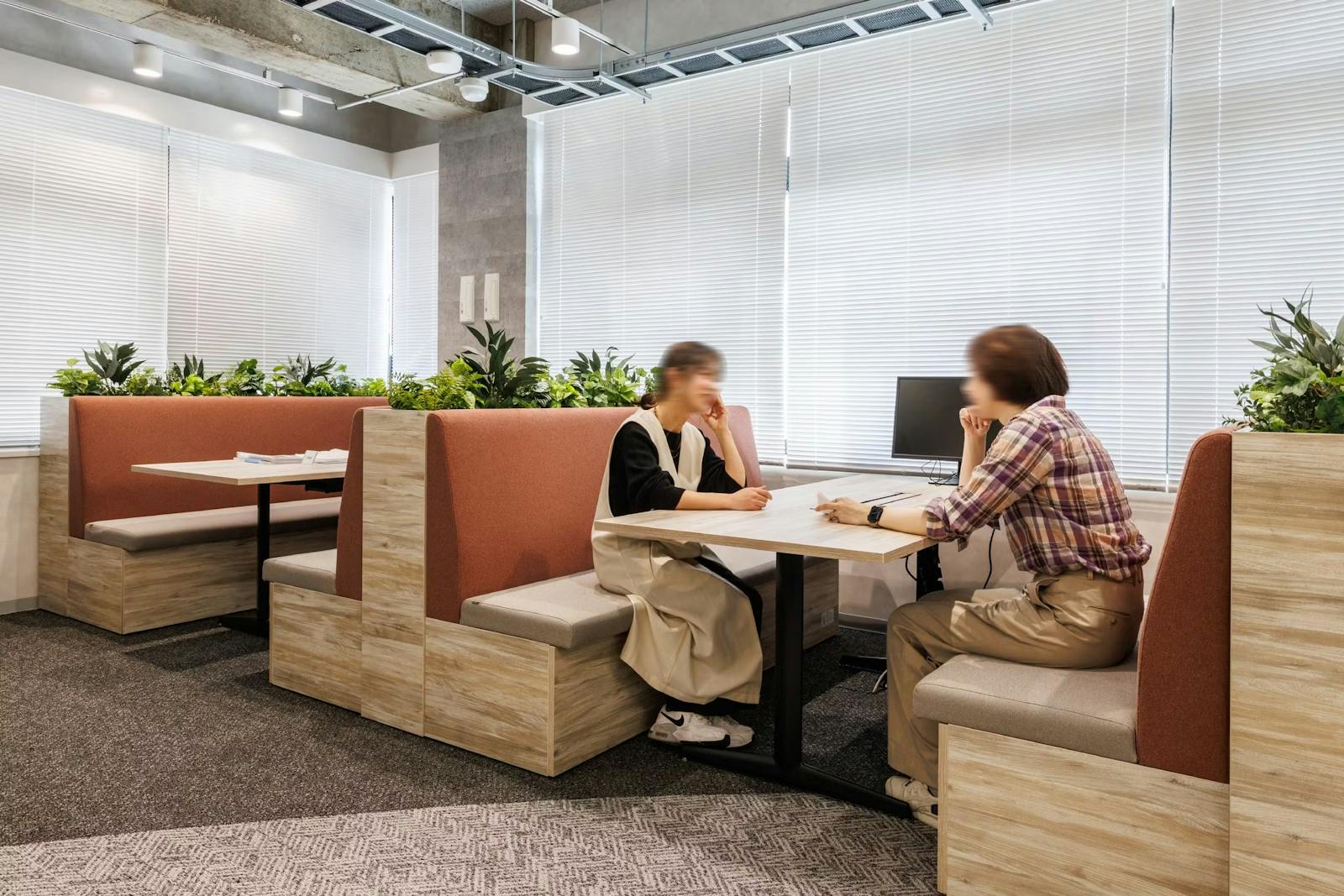 カウンターメインの個人席には自然光に映えるグリーンの植栽があしらわれ、まるで公園にいるかのような開放的な空間に。対面席にもグリーンが適度な目隠しになり、プライバシーを保ちながら快適に過ごせる工夫が施されています。