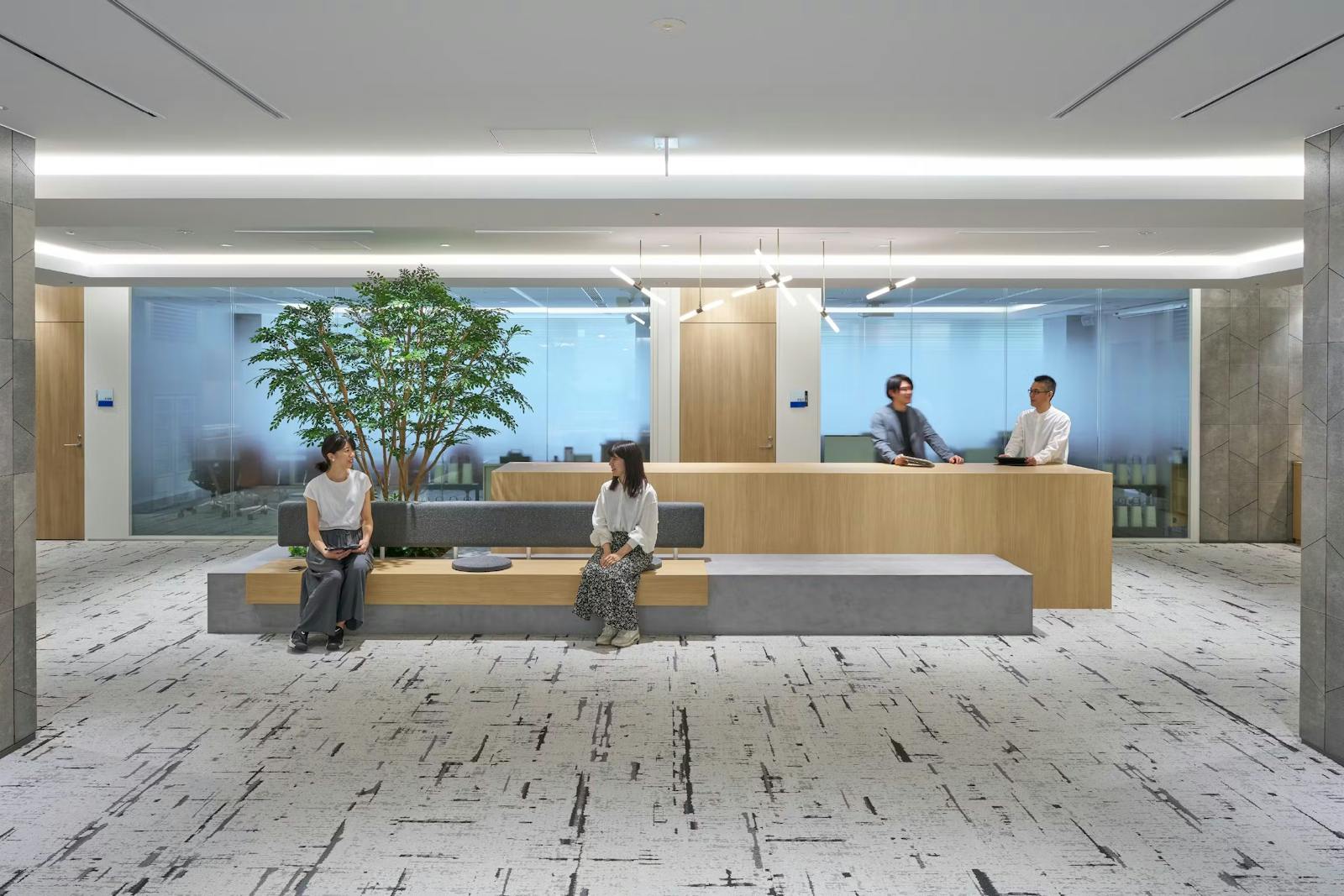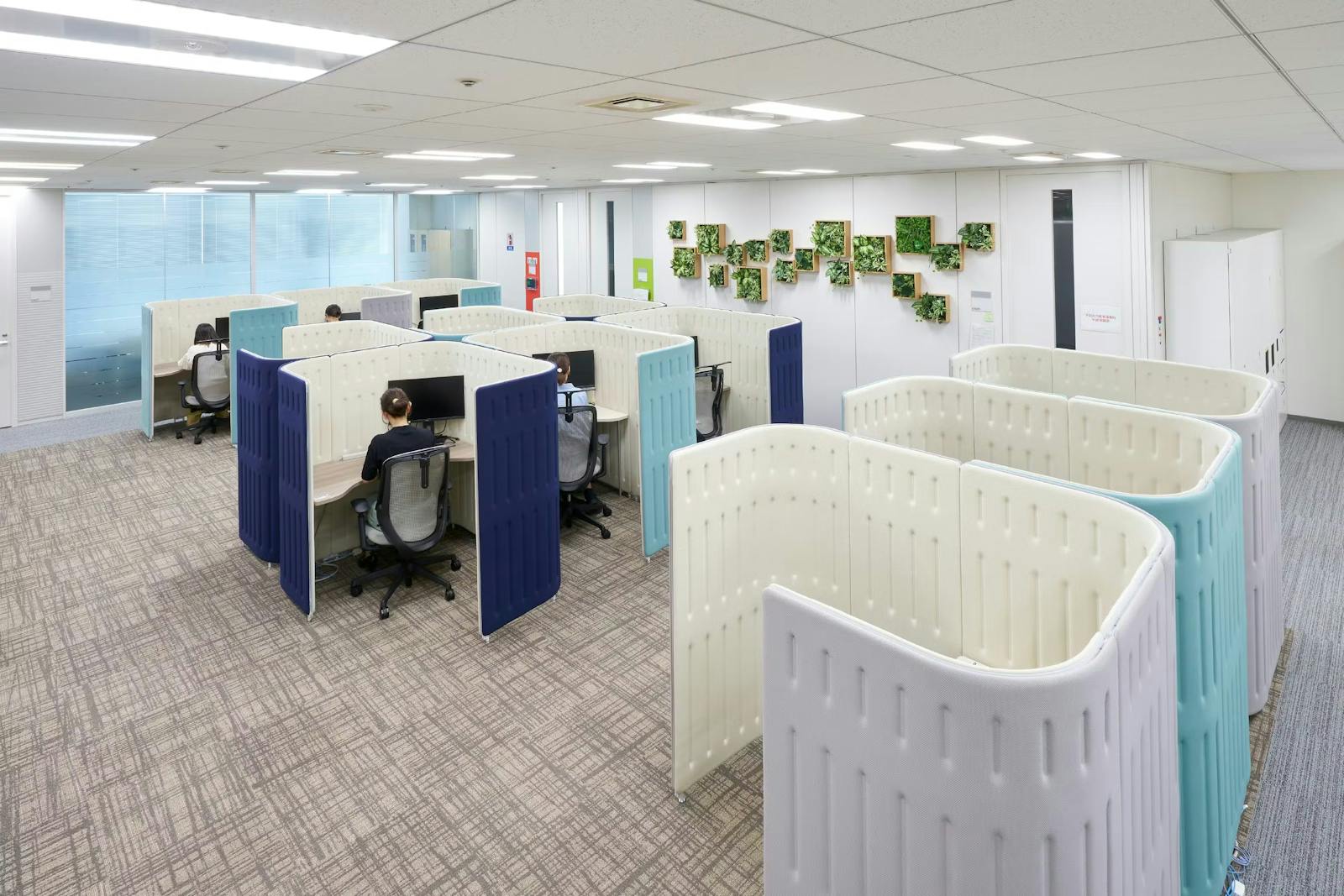 会議室前のラウンジには、木陰で語らうようなリラックス空間を設置。グリーンが柔らかな雰囲気をつくり出し、会議後の立ち話や休憩の場として活用されています。また、集中席が並ぶエリアの壁面にもグリーンパネルを設置。閉鎖的になりやすい空間にグリーンを飾ることで彩りが生まれ、快適性を高めています。