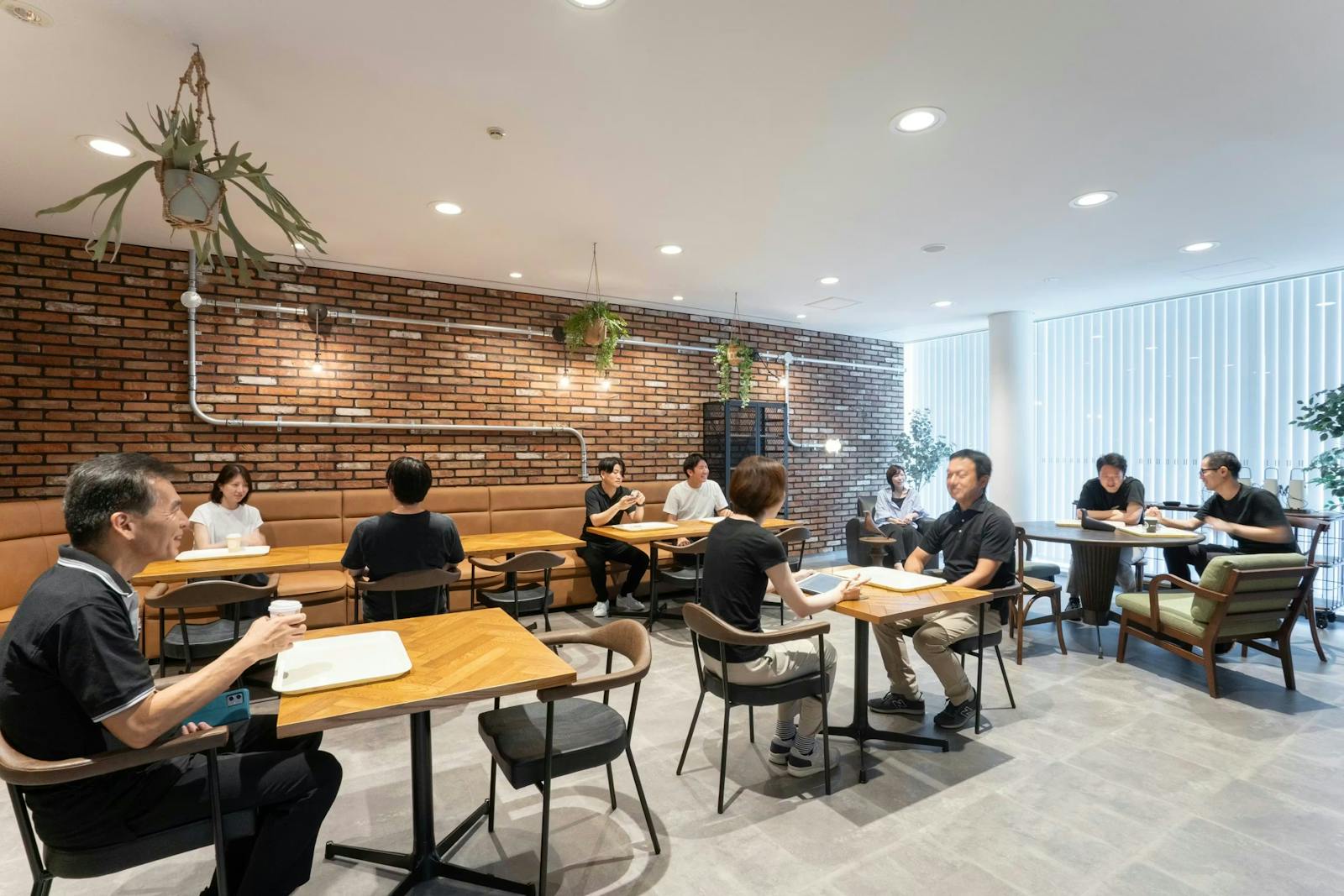 食堂に隣接するエリアに設けた「食堂会議室」では、日々ランチミーティングやラフな会議が開催されます。ニューヨークのブルックリンをイメージした空間には、吊り下げタイプのグリーンを配置。落ち着いた雰囲気のリラックスできる空間では、相手との距離が自然と縮まり、さまざまなアイデアが生まれています。
