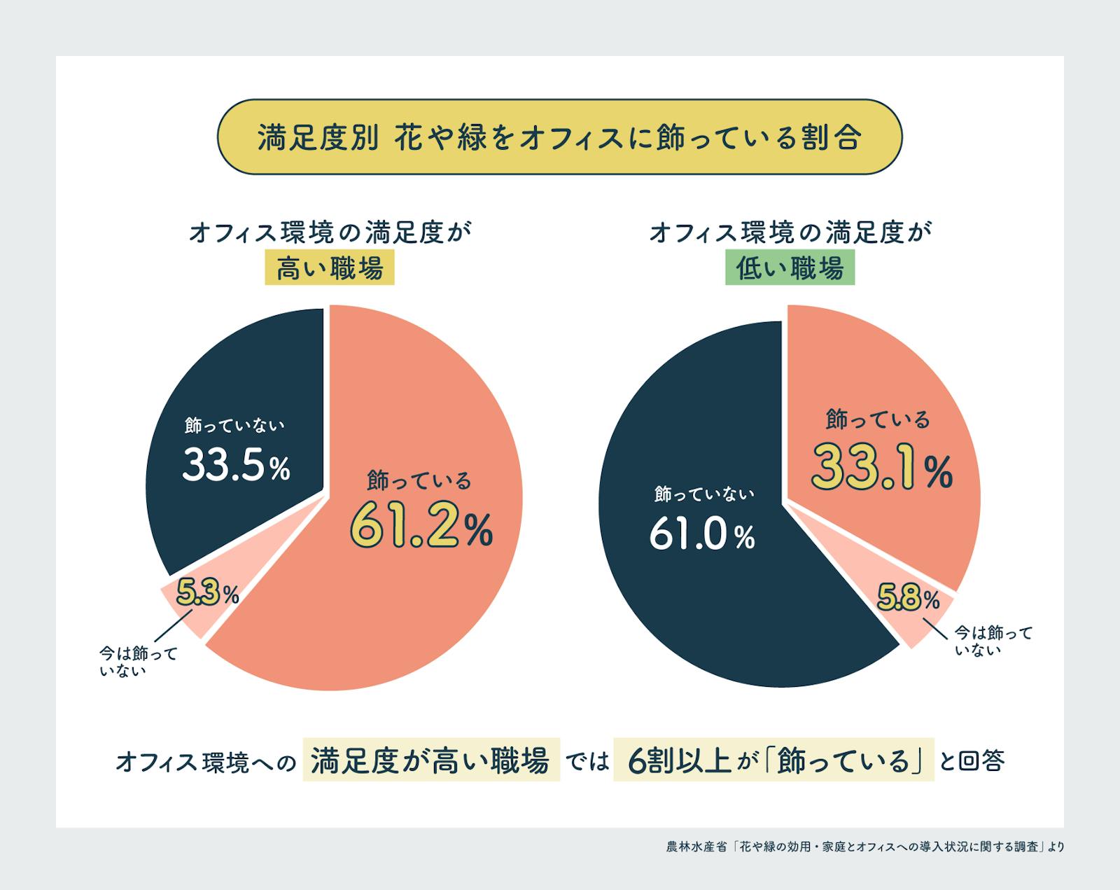さらに注目すべきは、オフィス環境への満足度との関係です。満足度が高い職場では6割以上が「職場に植物を飾っている」と回答した一方で、満足度の低い職場では3割程度にとどまりました。この結果から、植物の存在が働く人の気持ちにポジティブな影響を与えていることがうかがえます。