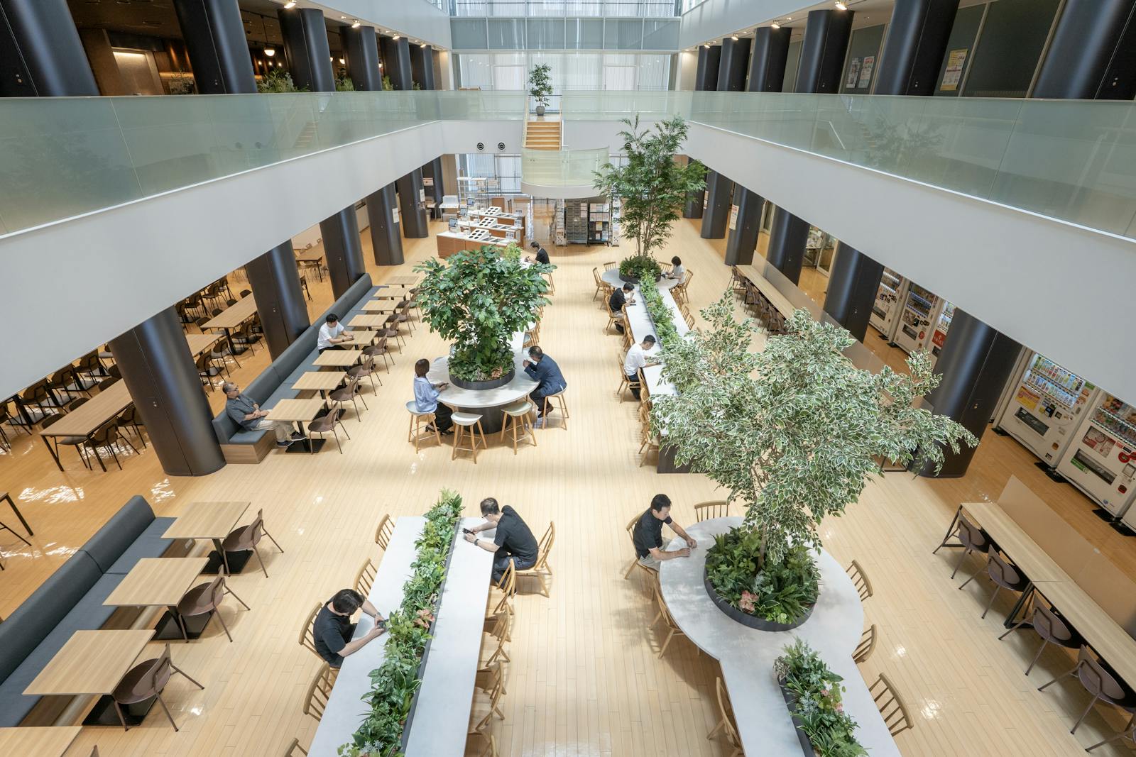 - 社員食堂の吹き抜けに植栽を配置し、自然と人が集うリフレッシュ空間に