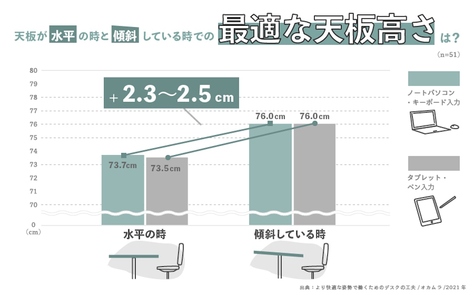 傾斜時と水平時で見られた、最適な天板の高さの違い