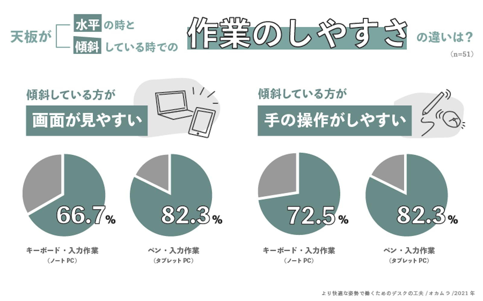 この結果から、天板の傾斜を活かすには、昇降機能によって天板高さを調整できることが大切だと言えるでしょう。