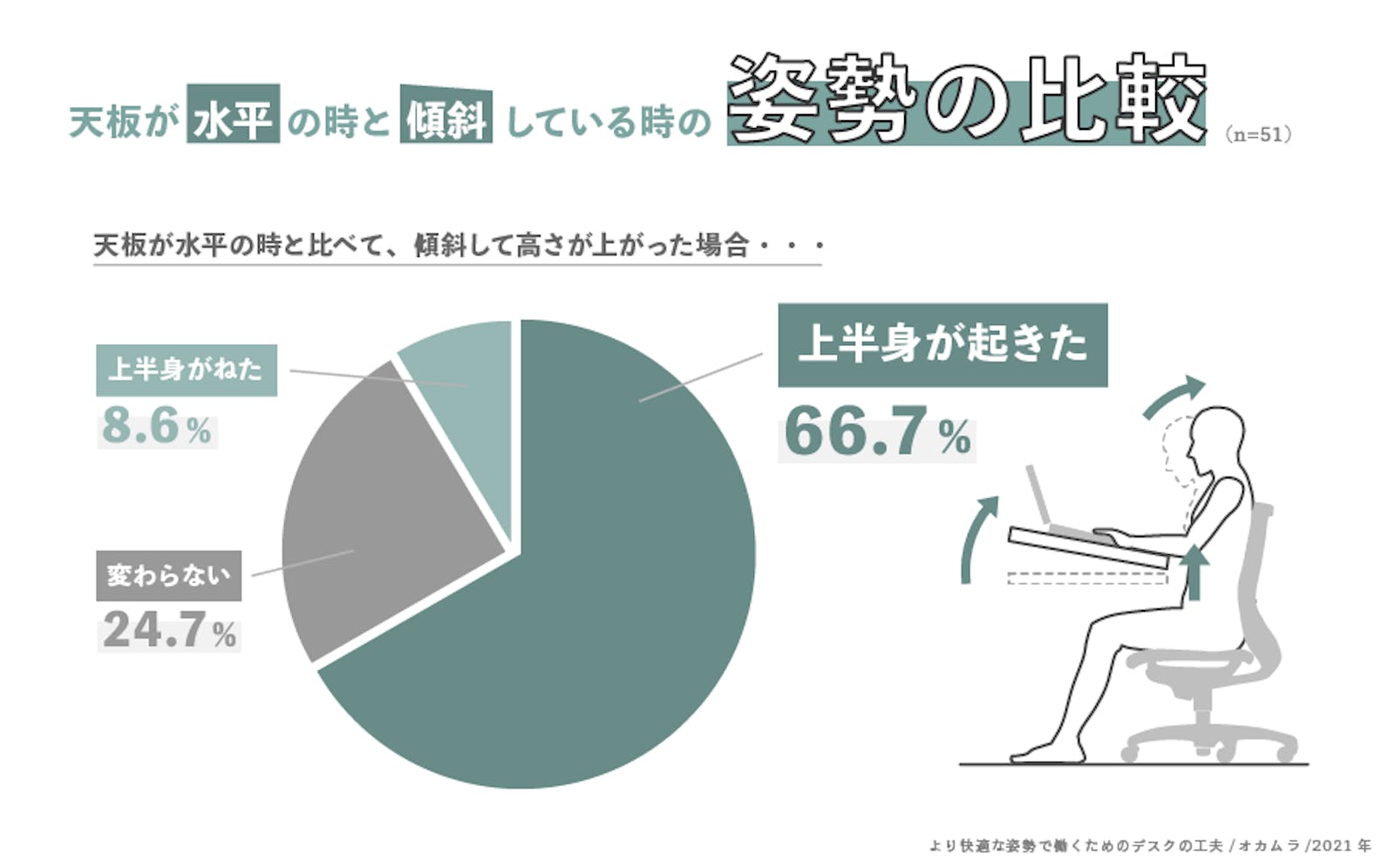さらに、実験協力者からは「傾斜ありのほうが、首への負担が少なく感じた」「椅子に背を預けた姿勢となるので、とても楽」「傾斜天板だと、椅子の背もたれに背中をつけたまま作業していることに気が付いた」という声も上がりました。