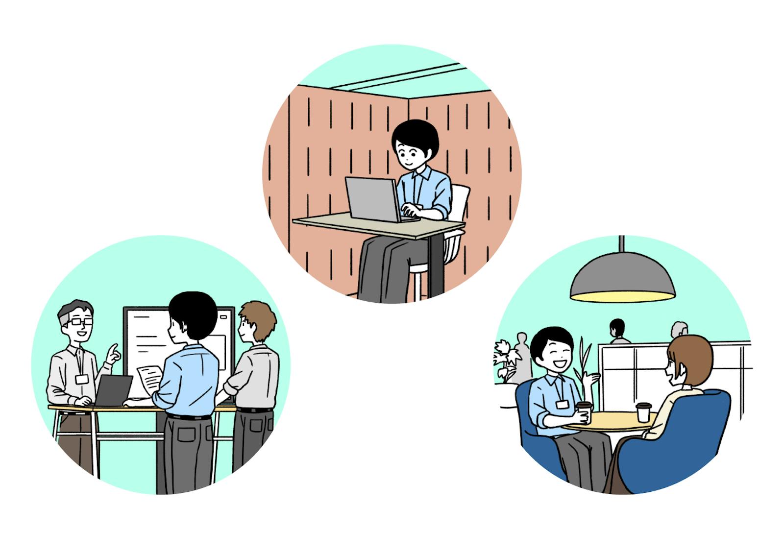 ABWの最大のメリットは、仕事内容に応じて最適な環境を選べる点にあります。集中力が求められる業務は静かなスペースで、カジュアルな打ち合わせやブレインストーミングはオープンなエリアで行うなど、「その仕事に合った場所」を選択できるため、周囲の音や視線を気にしながら無理に作業を続ける必要がなくなるのです。