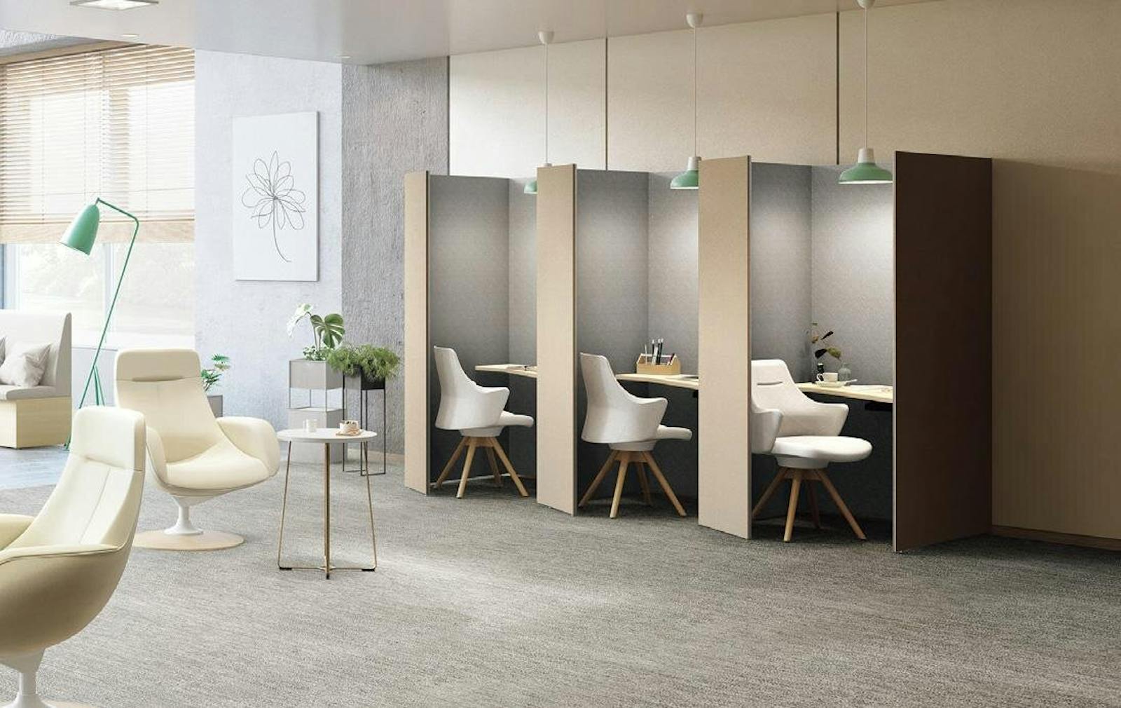drape(ドレープ)は吸音パネルがワーカーを包み込む、ミニマムサイズのワークブースです。視線がブースの角に向かっているため、周囲の人の動きが視界に入りにくく、じっくり仕事に専念したい時の集中エリアに適しています。