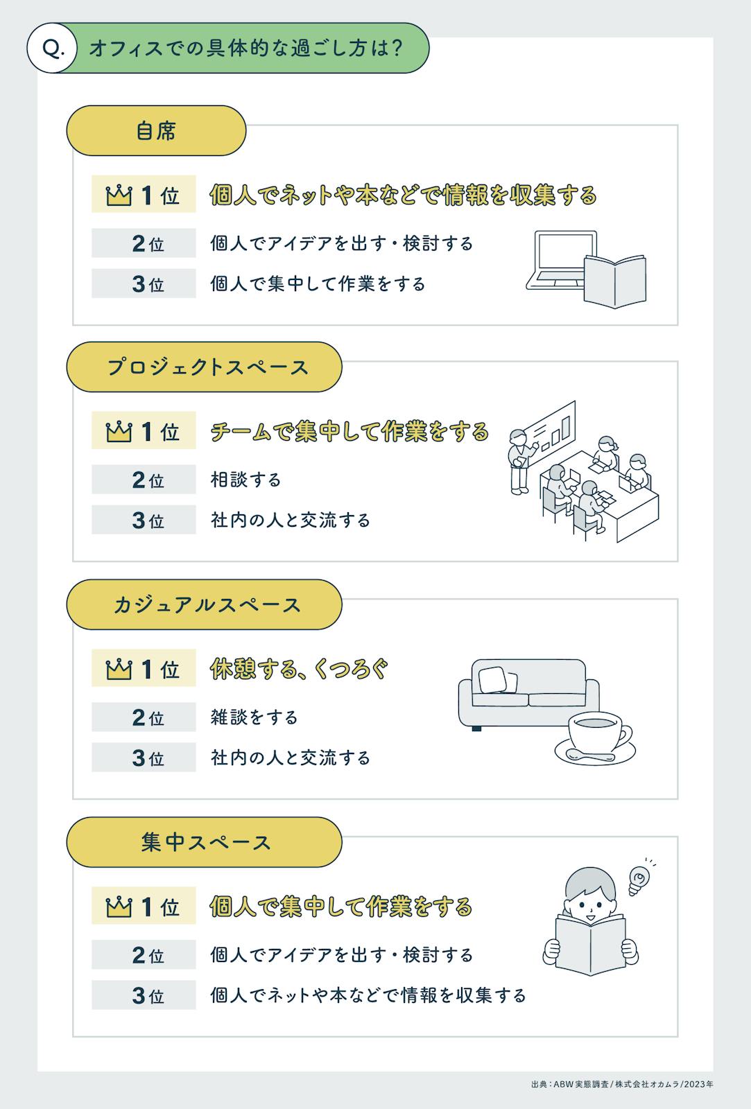以下は、オカムラが2023年に実施した調査結果をもとに、ABWを実践している人がオフィスでどのように過ごしているかを示したものです。スペースごとに、頻度の高い過ごし方を上位3つまで抜粋しています。