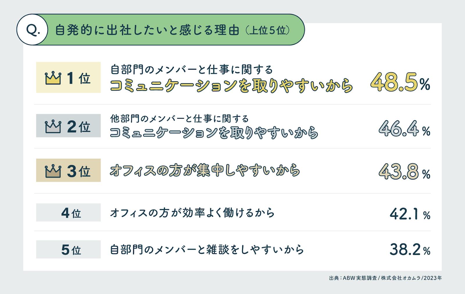 実際に、オカムラが2023年に実施した調査では、「自発的に出社したいと感じる理由」に対し、「自部門・他部門のメンバーと仕事に関するコミュニケーションを取りやすいから」と回答した人が多く、コミュニケーションのしやすさが出社動機につながっていることが明らかになりました。