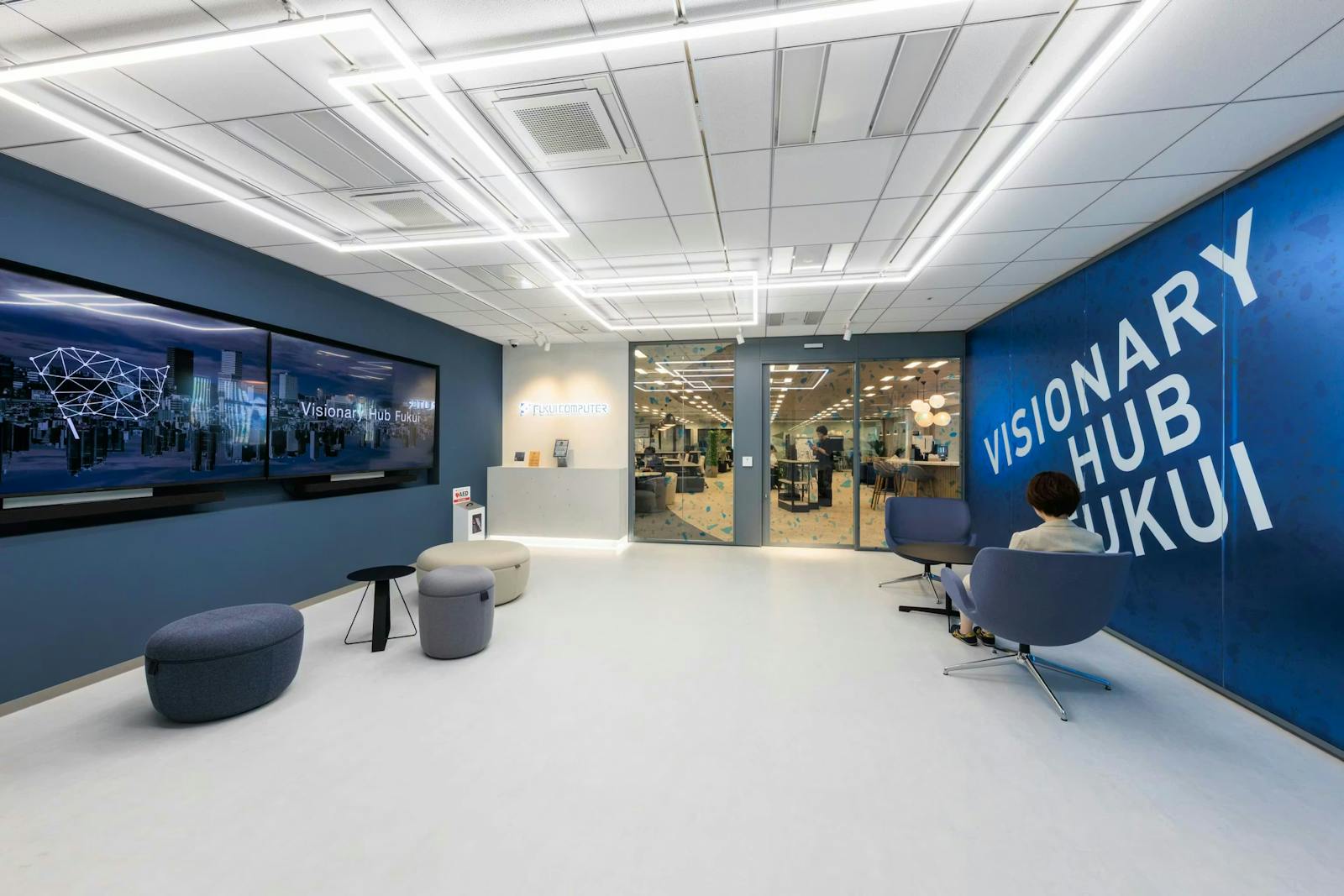 福井コンピュータホールディングス株式会社 様のコーポレートカラーを配したエントランスの壁面には、福井のにぎわいを追い風とし、同社の将来を見通した活動(ビジョナリー活動)を展開する場にしたいという思いから「VISIONARY HUB FUKUI」の文字が描かれています。福井県内にある3つの拠点を表現した照明、福井でしか採れない福井名石・笏谷石(しゃくだにいし)を使用するなど、企業の思いや地域とのつながりを表現した空間となっています。
