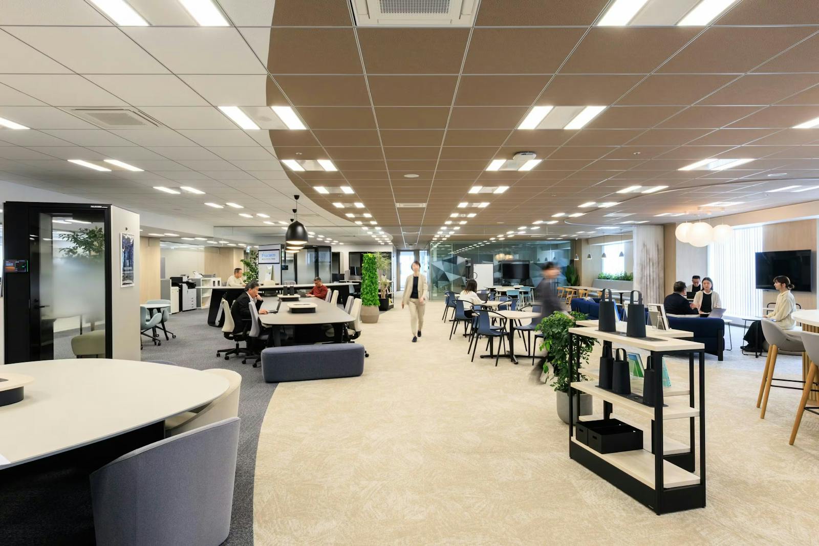 日東電工株式会社 様は、新棟を増築することで不足していた機能を確保し、新たなつながりを生むスペースの創出に成功した事例です。執務室は、視線を遮るものがない見通しの良い空間が特長。ABWに加えてグループアドレスを採用し、部署内のコミュニケーションが活発に行われています。執務席とミーティング席はカーペットの色を変えてゾーニングされており、壁側には集中して作業に没頭できるワークブースが並び、そのときの気分や業務内容によって場所を自由に選択できます。