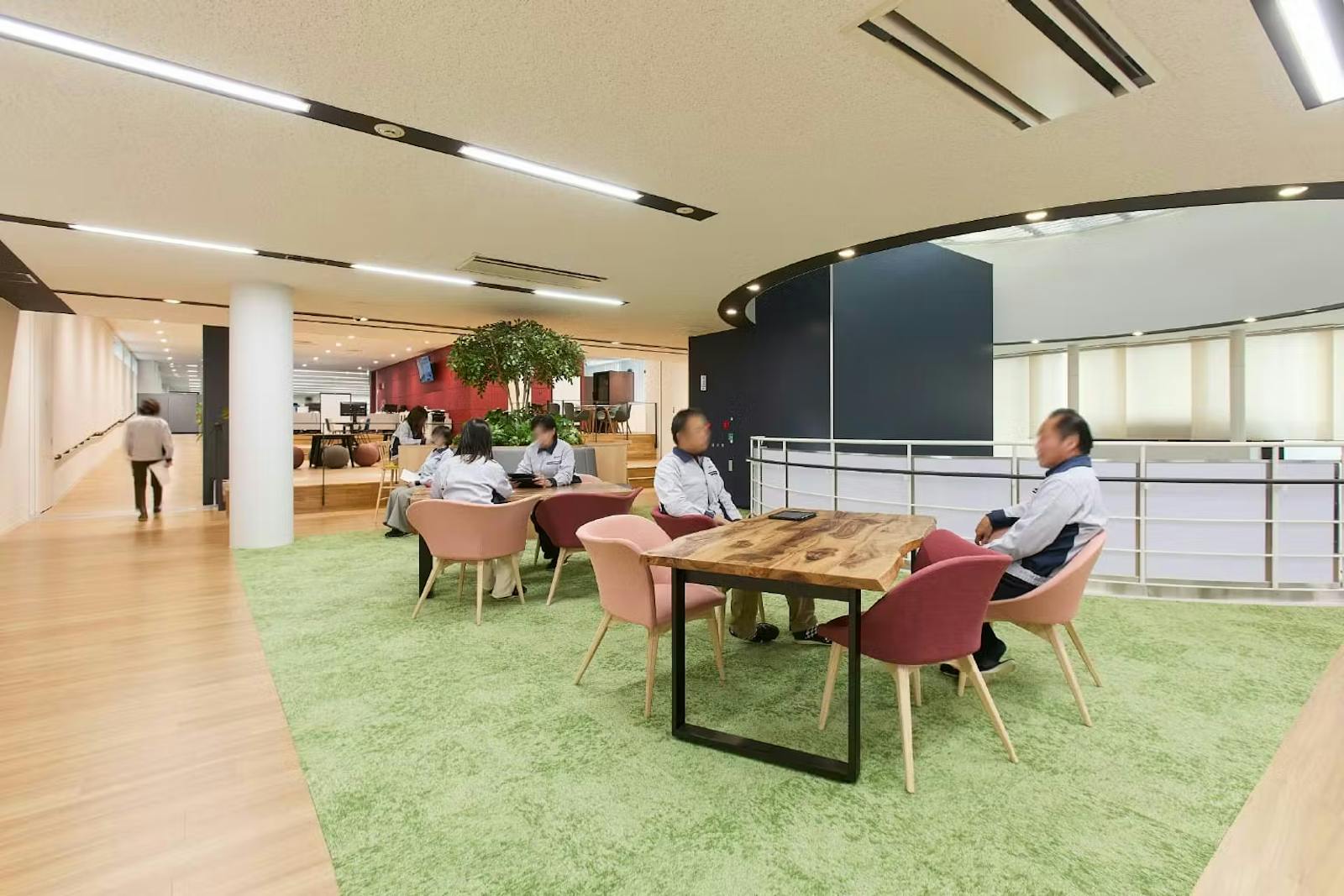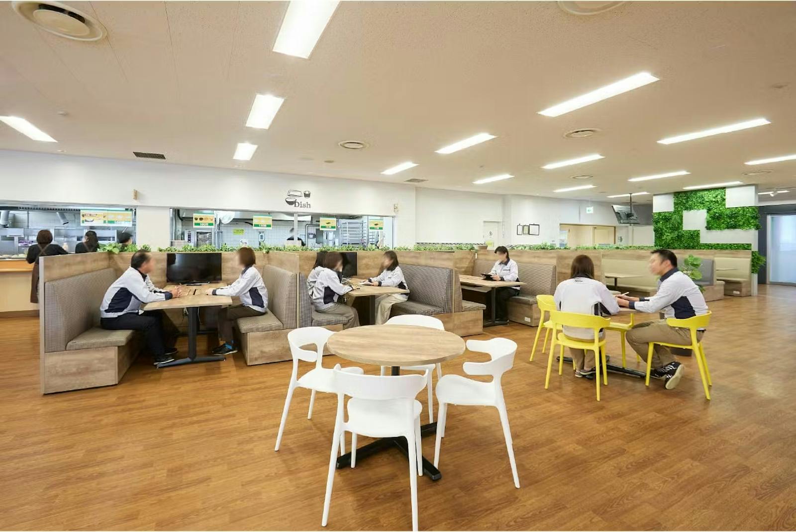 執務エリアの中央、既存棟と新棟をつなぐスキップエリアに設置された交流エリアは、休憩スペースとしてはもちろん、ちょっとした打ち合わせを行う場としても利用されています。また、近隣に飲食店や商店がないため完備していた社員食堂も、利用満足度向上のためにリニューアル。社員食堂にはファミレス席など多様な席が揃い、食事のほかにもカジュアルな会議や打ち合わせなどのワークスペースとして活用されるなど、利用者が増加しました。