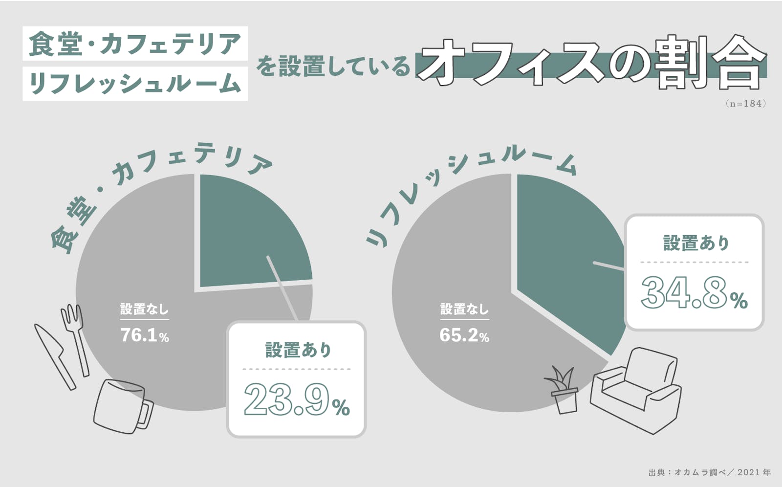 オカムラが2021年に集めたデータから、食堂・カフェテリア、リフレッシュルームを設置しているオフィスの割合を調べてみました。結果は、下記の通りです。