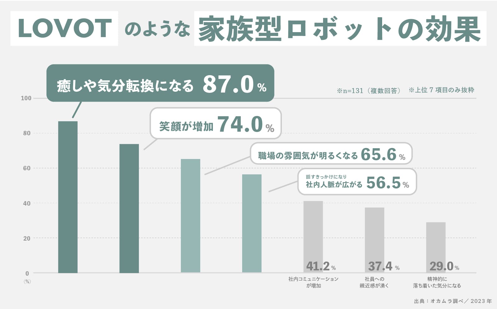 さらに、LOVOTの設置期間を終えた段階で改めてアンケートを行いました。LOVOTのような家族型ロボットがオフィスにいることで、どのような効果があるか尋ねたところ、約9割の人が「癒しや気分転換になる」と回答し、7割以上の人が「笑顔が増加する」と回答しています。