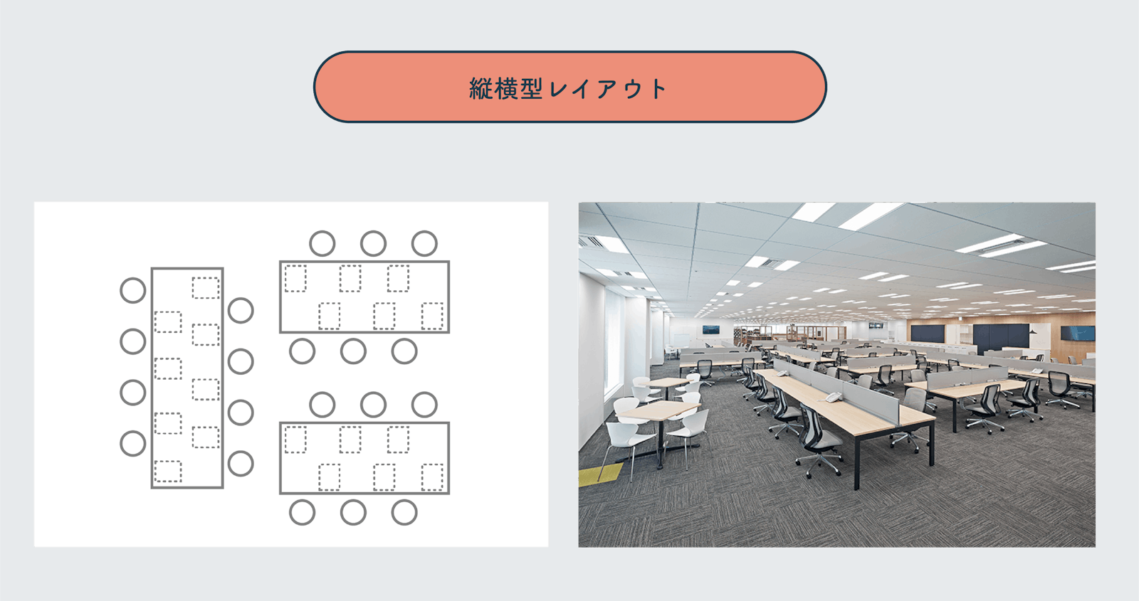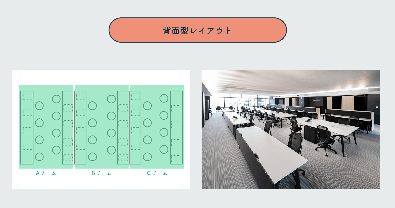 ・特徴:チームメンバーと背中合わせでグループを形成するレイアウトです。エンジニアやデザイナーをはじめ、集中力や創造力を要する業務に向いています。