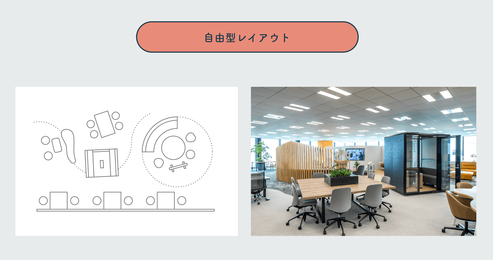 メリット: ・型に縛られることなく、企業の文化やオフィスコンセプトにあったレイアウトが実現可能 ・従来のオフィスらしくない、先進的でおしゃれな空間を構築できる ・工夫次第で、コミュニケーションの機会を増やすことができる |