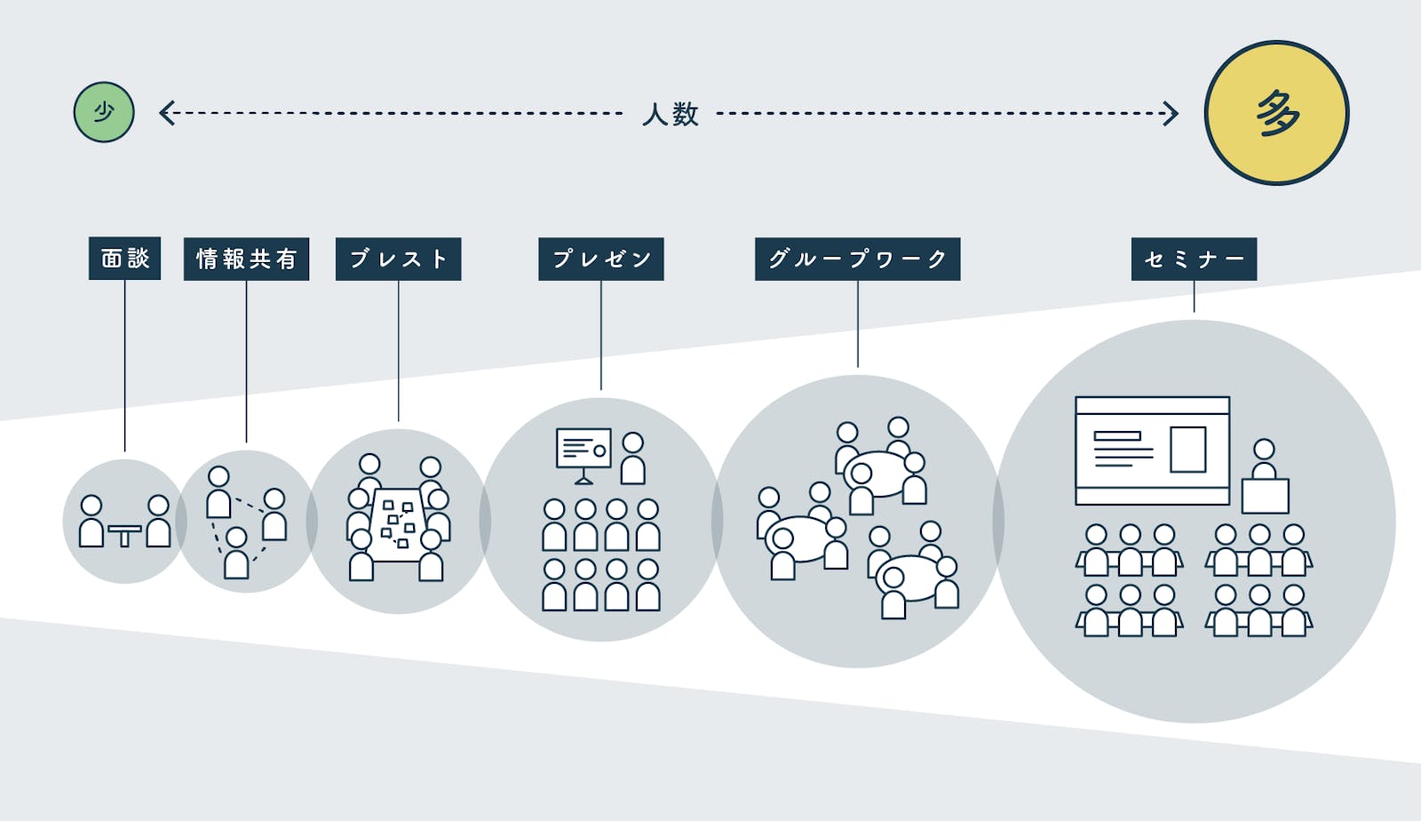 会議室を「単なる場所」から「コミュニケーションと創造性の中心地」に進化させるためには、会議の種類・目的別に設えを変える必要があります。そのため、コミュニケーションづくりを考えるときはまず、自社内でどういった会議・ミーティングが行われているかを知っておくことが大切です。